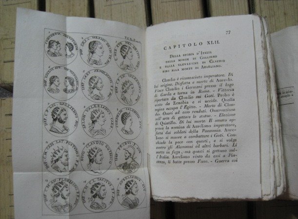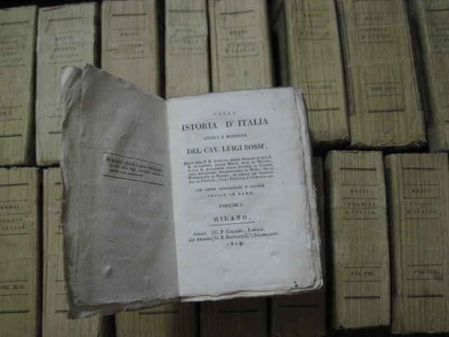 19 voll. in-16° (153x90mm), pp. 10.000 ca. complessive, belle brossure editoriali verdine con la Lupa Capitolina che allatta Romolo e Remo e titolo entro bordura xilografica. Complessive 95 tavv. incise in rame f.t. di ritratti, scene storiche, carte geografiche e medaglie. Freschissima copia in barbe. Prima edizione di questo amplissimo tentativo di storia d'Italia dall'antichità alla Pace di Campoformio; esistono due tirature della prima edizione, una in-8° grande ed una in questo formato. L'opera fu severamente giudicata dal Croce nella 'Storia della storiografia italiana nel secolo decimonono: 'Il sommo di tutti i lavori mossi dal sentimento politico, anzi etico-nazionale, e quello su cui tutti i voti si raccoglievano, era, com'è ben naturale, una Storia d'Italia, della quale si avvertiva la mancanza, poiché le antiche non più contentavano. Quella recente del Denina non conferiva certo né all'erudizione né alla critica né al sentimento; e non la sostituiva il libro del Bossi, frettoloso, compendiato sul Muratori e sul Tiraboschi, mal ordinato e non ben giudicante'. Il canonico Luigi Bossi (Fagnano Olona, 1758-Milano, 1835) fu autore, oltre che di questa voluminosa 'Storia d'Italia', di svariate dissertazioni scientifiche, numismatiche, archeologiche; egli fu anche Prefetto degli Archivi del Regno Italico e uomo politico (fu deputato al Corpo legislativo della prima Cisalpina e ai Comizî di Lione). Brunet, I, 1129. Graesse I, 501. Platneriana, p. 165. Branca, Bibliografia storica, n. 932: 'Esistono due edizioni, l'una in ottavo grande, l'altra in diciottesimo molto più economica. Ambedue contano diciannove volumi. L'autore assai si diffonde sulla parte antica, e sfugge frettoloso sugli avvenimenti della media e della moderna età. Questo libro, che conserva ancora qualche pregio per la storia antica, anziché una storia, dà una serie di dissertazioni sulla storia. Nessuno nega però che abbia accresciute le ricchezze dell'antiquaria e della numismatica'. Cfr., sul Bossi, Poggendorff, I, 248-49; Lucia Sebastiani in D.B.I., XIII, 1971; Giorgio Federico Siboni, Luigi Bossi. Erudito e funzionario tra Antico regime ed Età napoleonica, Milano, 2010.