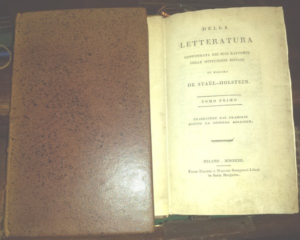 In-8 (22 cm) 2 voll. XVI 239 (1); 340 (2). Elegante legatura moderna in piena pelle. Staël-Holstein de Germaine (1766-1817) conosciuta come Madame de Staël fu una scrittrice francese di origine svizzera, a cui si attribuisce l'inizio della discussione tra classici e romantici pubblicando sul primo numero della Biblioteca Italiana un articolo intitolato "Sulla maniera e l'utilità delle traduzioni" nel quale criticava i classicisti per la loro staticità nelle tematiche, ormai antiche e ripetitive.