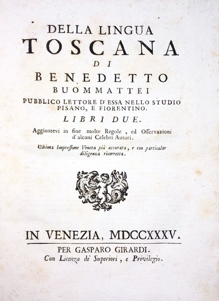 Della lingua toscana di Benedetto Buommattei pubblico lettore d'essa nello studio pisano, e fiorentino libri due. Aggiuntevi in fine molte Regole, ed osservazioni d'alcuni celebri autori. Ultima impressione veneta piu accurata, e con particolar diligenza ricorretta.