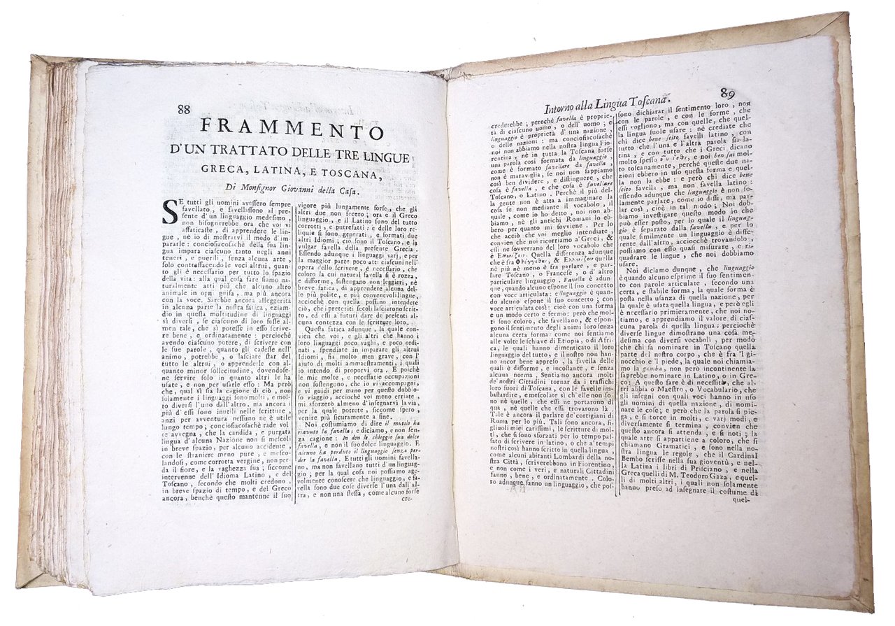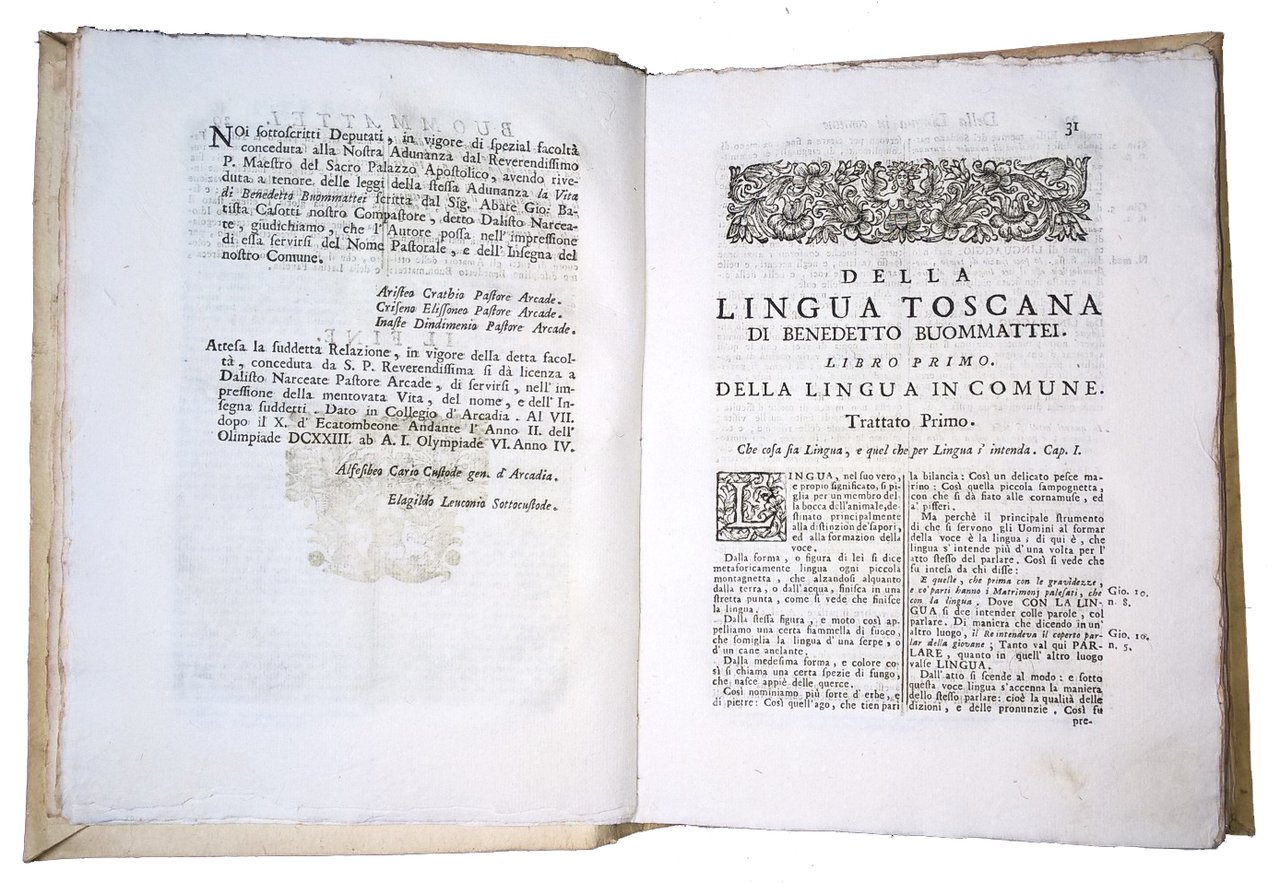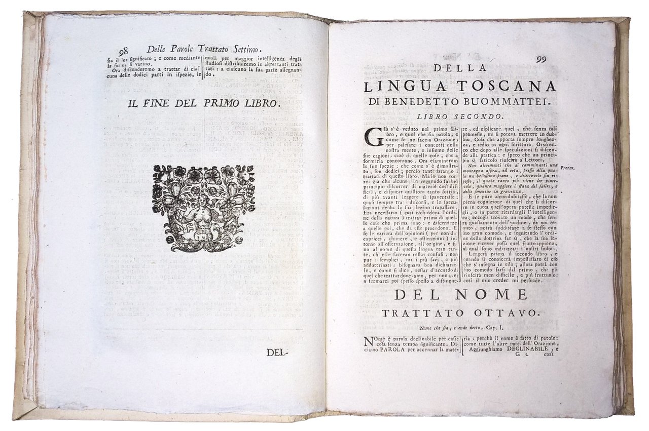 in-4°, 244x178 mm, leg. coeva in cartonato muto, titolo manoscritto al dorso; pp. [8], 246, [10], 92. Fregio sul frontespizio. Iniziali e fregi xilografici. A carta Q7 inizia con occhietto: "Aggiunta di regole, e osservazioni di varj autori intorno alla lingua toscana". Riedizione, arricchita dalla vita del Buommattei scritta da Dalisto Narceate Pastore Arcade, di questo famoso testo di grammatica, pubblicato in prima edizione nel 1643 e poi ristampato fino all'inizio dell'800. Benedetto Buonmattei (1581-1648) è stato un presbitero e grammatico italiano. Prov.: Iscrizione d'appartenenza manoscritta alla prima guardia libera anteriore. Rif.: IT\ICCU\TO0E\014603. OCLC, 799078882. Cond.: Lievi segni d'uso. Carte in barbe con presenza occasionale di fioriture. Copia molto buona. -- Very good Venetian re-edition, enriched by the life of the Buommattei, of this famous grammar text of the Tuscan [Italian] language, first published in 1643 and then reprinted until the beginning of the nineteenth century.