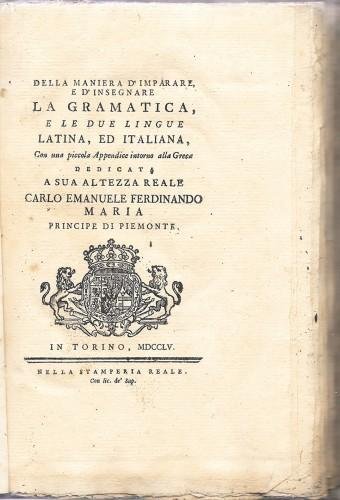 in 8°, pp. 8 nn., 159, cartone rustico coevo; stemma reale inc. al front., capil. e test Opera dedicata a Sua Altezza Reale Carlo Emanuele Ferdinando Maria, Principe di Piemonte; esempl. in barbe con carta forte e ampi margini. 346/31