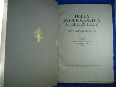 In-4°, pp. 64 nn., cartonatura editoriale con vignetta in oro al piatto. 25 tavv. riquadrate in oro applicate f.t., sia a colori che in b.n., di Gabriella Fabbricotti. Un facsimile a piena pag. della lettera autografa inviata da Francesco Savoia-Aosta alla Fabbricotti. Perfetta copia in barbe conservata entro custodia. Unica edizione, rara, limitata a 500 esemplari numerati (n° 426, con firma a tampone della curatrice alla giustificazione di tiraggio) su carta a mano beige vergellata e filigranata. Comprende 25 agiografie e leggende, fra le prime del Cristianesimo, ispirate alla Leggenda Aurea di Jacopo da Varazze. La contessa Gabriella Fabbricotti, nata nel 1878 e morta nel 1943, moglie dell’ammiraglio Francesco Bertonelli, fu stimata pittrice e illustratrice.