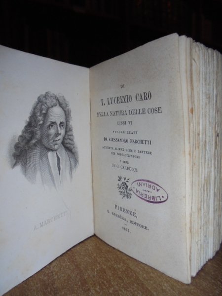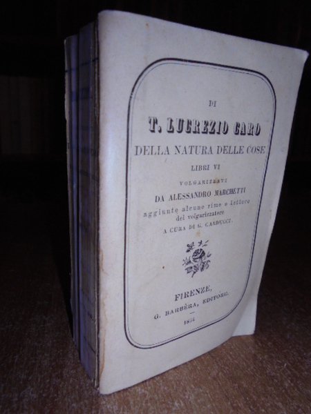 LUCREZIO CARO, T. Firenze, Barbèra, 1864. Della natura delle cose libri VI volgarizzati da Alessandro Marchetti. Aggiunte alcune rime e lettere del volgarizzatore a cura di G. Carducci. In-24°, br. cop. orig. lxvii, 626 pp. con ritratto del Marchetti. Presenza di scotch al dorso ma ben conservato e intonso. Ex libris al front. (Collezione Diamante). Neg. mob. 4.