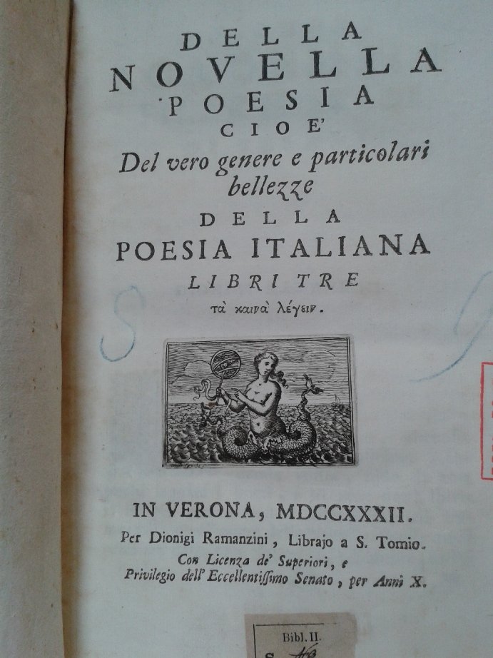 Volume in 4, legatura d'epoca in cartonato rustico, titolo manoscritto al dorso, sguardie, frontespizio con bella marca tipografica incisa, dedicatoria e prefazione, (12) 391 (3) pp., registro e colophon adornato di grande marca incisa dell' 'Accademia Filarmonica di Verona'. Importante e particolare lavoro di questo scrittore e tipografo veronese, che con quest'opera dimostra essere un critico innovatore, scoprendo una letteratura italiana autonoma da quella greca e latina, occupando cos un posto notabile nella storia del preromanticismo. Opera curiosa ed interessante, stampata a grandi margini su carta ancor fresca e candida, in barbe. Lievissime fioriture solo alle prime carte, un timbro della biblioteca estinta antonianum al frontespizio. Edizione originale arricchita da bei capilettera e fregi ornamentali. In pi che bello stato. Rara ed importante.