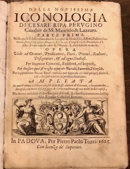 Della novissima Iconologia. Parte prima (Parte seconda e Parte terza) nella quale si descrivono diverse Imagini di Virtù, Vitij, Affetti, Passioni humane, Arti, Discipline, Humori, Elementi, Corpi Celesti, Provincie d’Italia, Fiumi, tutte le parti del Mondo, & altre infinite materie. Ampliata in quest’ultima Editione non solo dallo stesso auttore. ma ancora arricchita. dal Sig. Gio. Zaratino Castellini Romano