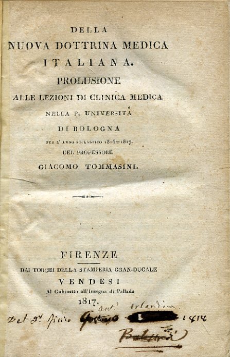2 opere in un vol. in-8° (190x124mm), pp. (4), 98, (1). Segue: Giovan Battista Spallanzani, Sulla nuova dottrina medica italiana testè sviluppata dal signor professore Giacomo Tommasini. Lettere medico-critiche, Reggio (Reggio Emilia), per G. Davolio e figlio, 1818, pp. 260. Legatura moderna in p. pelle con titolo e fregi in argento al dorso. Firma di possesso del tempo al primo frontespizio. Ottimo esemplare. Leggere bruniture alla prima opera. Edizione originale di entrambe le opere. Le teorie browniane, derivanti dalla scuola di Edimburgo di William Cullen, sostenevano l'emanazione delle energie vitali dell'organismo dal sistema nervoso e la derivazione della vita da continui stimoli e l'impiego dei sedativi e dei salassi in terapia. Il Tommasini (Parma, 1768-ivi, 1846) fu insigne medico ed immunologo che esercitò la professione clinica sia nella città natale che a Bologna. 'Lultimo dei grandi sistematici italiani fu Giacomo Tommasini, il quale nel 1794 divenne professore di fisiologia e patologia allUniversità di Parma e nel 1816 fu chiamato alla cattedra di clinica medica di Bologna. Il T. fu dapprima seguace della dottrina del Rasori e fu anzi uno dei principali fautori di essa in Italia. Nel 1817 pubblicò il suo libro Della nuova dottrina , nel quale si staccò in parte dal Rasori affermando che la irritazione e non la diatesi è sempre locale e distinguendo le malattie in generali e locali. La nuova dottrina del Tommasini, sostenuta da questo con una serie di memorie e di osservazioni, molte delle quali furono tradotte in francese, ebbe una grandissima diffusione e procurò al Tommasini vasta rinomanza. Tutta una scuola di medici si formò intorno a lui' (Castiglioni, Storia della medicina, p. 524).