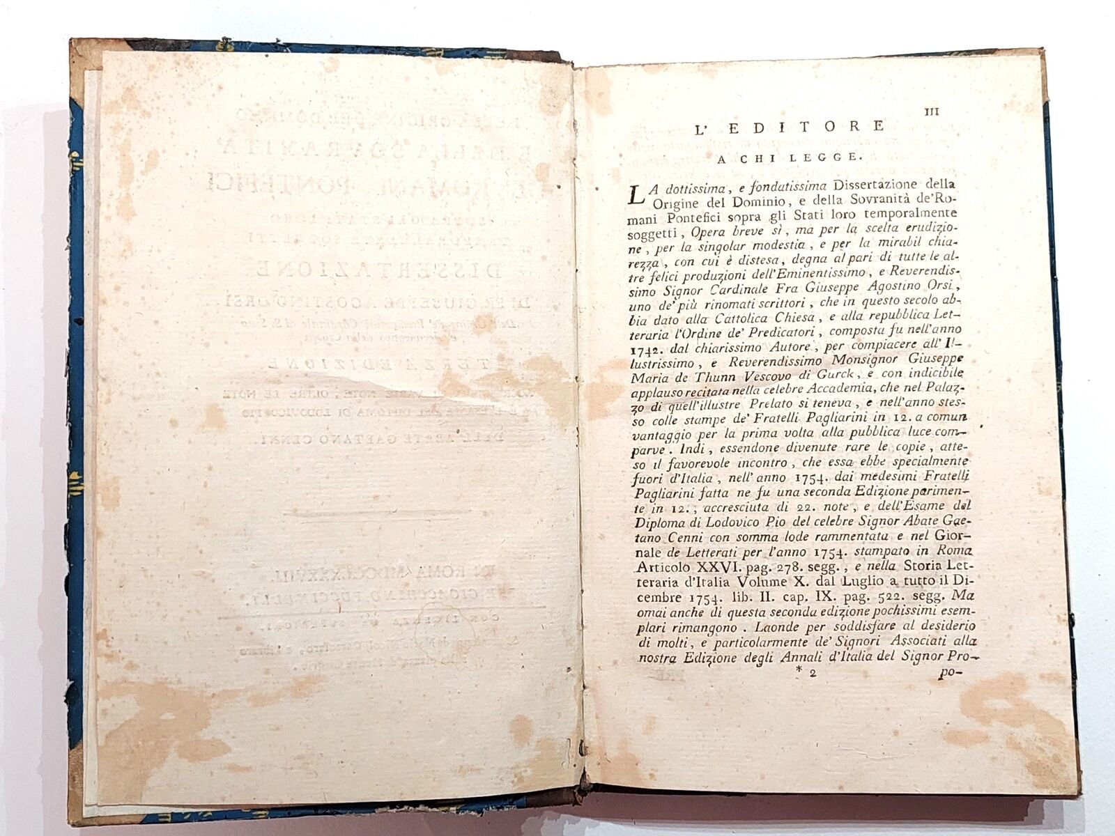 Della origine del dominio e della sovranità de' romani Pontefici sopra gli stati loro temporalmente soggetti Dissertazione di Fr. Giuseppe Agostino Orsi 3° edizione accresciuta di varie note, oltre le note e l'esame del diploma di Lodovico Pio dell'abate Gaetano Cenni Roma 1788