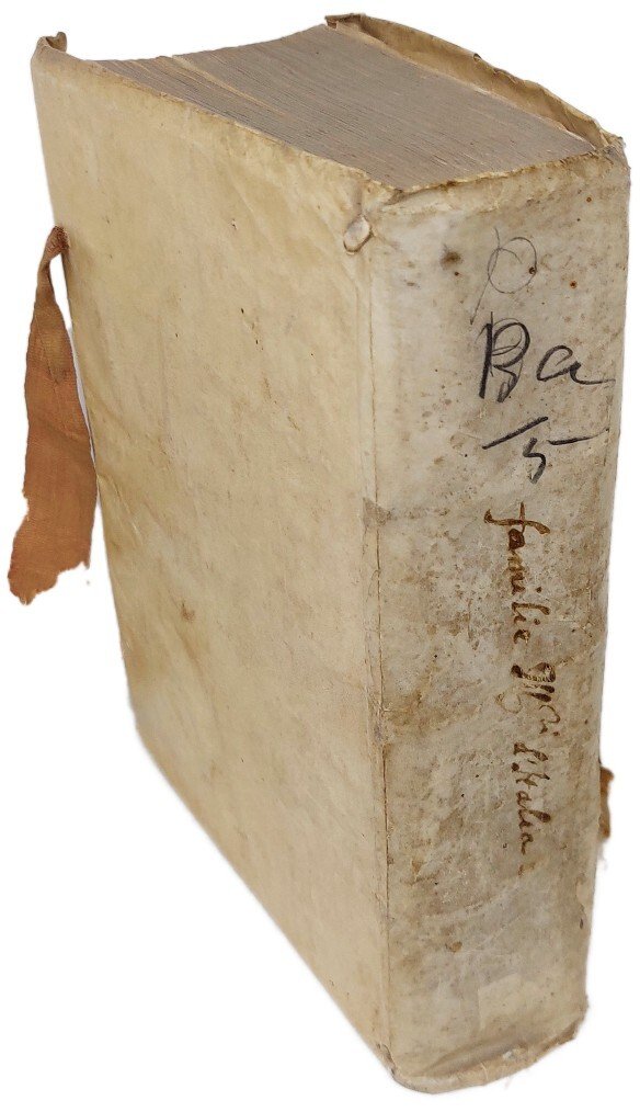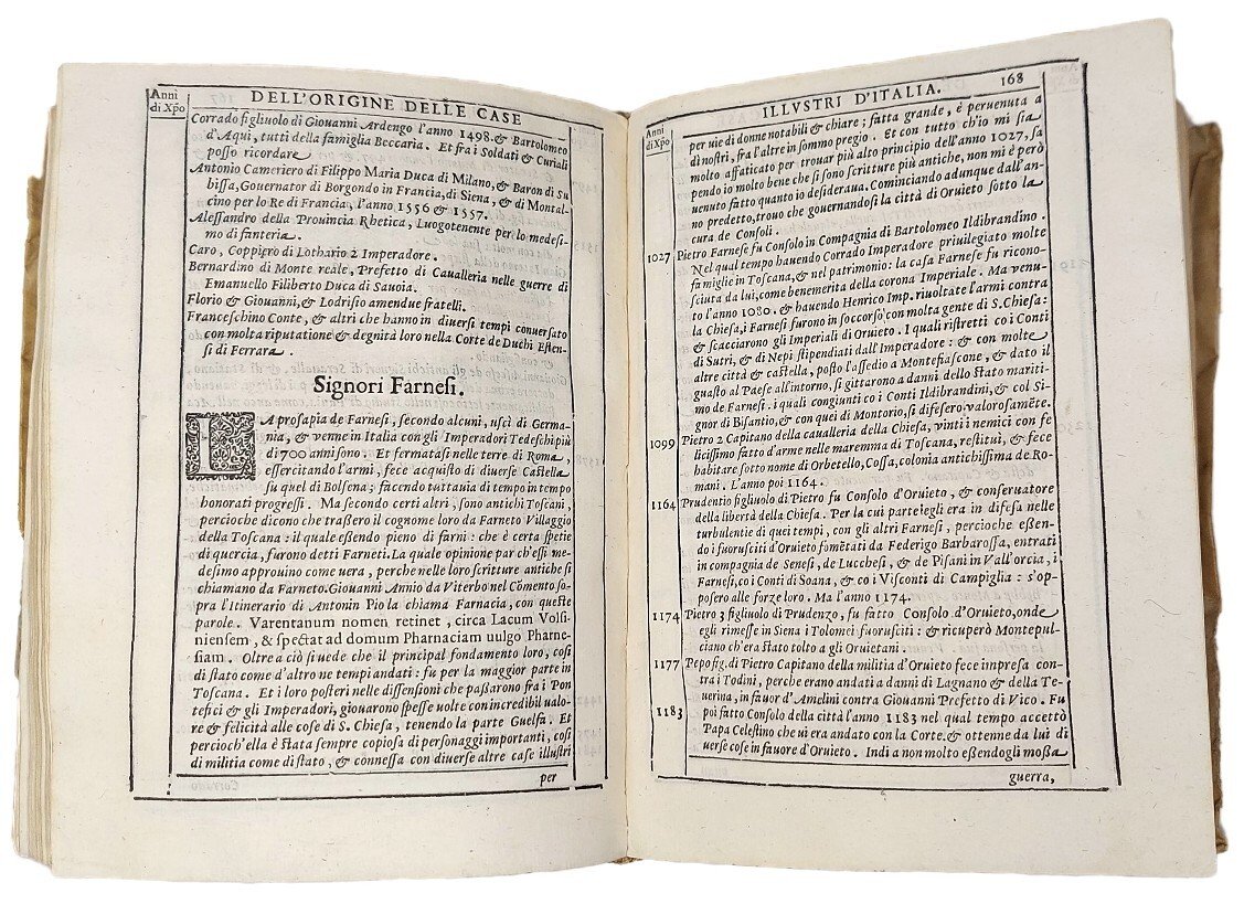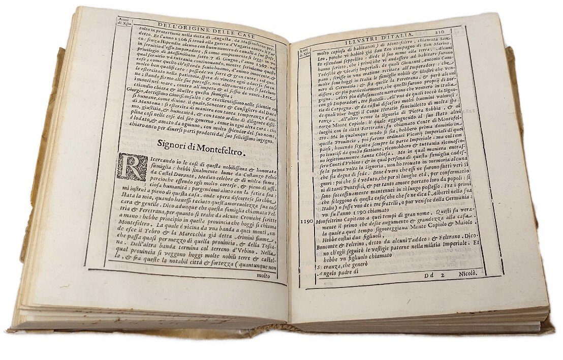 >in-4, ff. (6), 403, (1), legatura coeva in pergamena (difetti), titolo manoscritto lungo il dorso, lacci di chiusura. Al titolo impresa dello stampatore. Testatine, finalini, capilettera ornati, testo entro duplice filettatura. Opera dedicata a Rodolfo IIl. Edizione originale di questa importante e fortunatissima opera dedicata alla genealogia e alle vicende delle più illustri casate nobili italiane del Cinquecento, in seguito più volte ristampata, a proposito della quale, peraltro, si elevò il sospetto che essa non fosse altro che il rifacimento di una compilazione inedita di Giuseppe Betussi, la cui progettata opera celebrativa delle più illustri famiglie italiane non vide mai la luce e che il Sansovino avrebbe plagiato o rifuso, aggiornandola al 1582. ''Per quanto nell' Origine e i fatti delle famiglie illustri vengano completate, allargate, talora anche radicalmente modificate le accidentali notizie genealogiche che ricorrono nei lavori betussiani, pure un segno, una traccia resta sempre della materia e più ancora della forma e del metodo del letterato bassanese'' (G. Zonta, ''Note betussiane'' in Giorn. stor. d. lett. ital., LII, 353 sgg.). Francesco Sansovino (Roma, 1521 - Venezia, 1583), figlio del famoso scultore ed architetto Jacopo, fu stampatore, poligrafo e traduttore dal greco e dal latino. Ottimo esemplare, antica nota di possesso manoscritta al titolo ''Ludovici Iovii Hores Comensis'': Ludovico Giovio fu probabimente nipote del celebre Paolo e venne coinvolto nel 1586 nella divisione testamentaria del ''Museo Gioviano''. Cfr. Adams, II, S, 354. Graesse, VI, p. 267. Olschki-Choix 771.