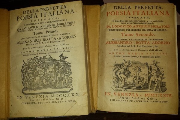 Della perfetta poesia italiana spiegata, e dimostrata con varie osservazioni, e con vari giudizi sopra alcuni componimenti altrui, da Lodovico Antonio Muratori, bibliotecario del Sereniss. sig. Duca di Modena Tomo primo-secondo). All'illustrissimo, ed eccellentissimo, sig. marchese Alessandro Botta Adorno marchese del S.R. I. di Palavicino, etc. Con le annotazioni critiche dell'abate Anton Maria Salvini, pubblico lettore di Firenze, e Accademico della Crusca.