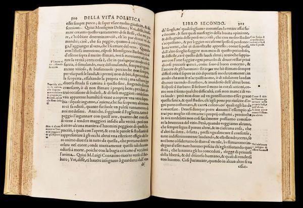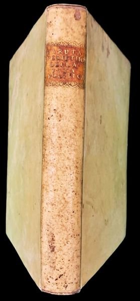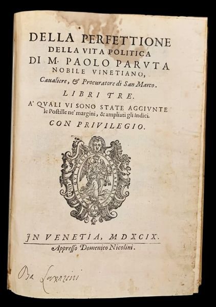 In 4° (24x16,5 cm); (48), 479, (1) pp. Legatura seicentesca in piena pergamena con titolo impresso in oro al dorso. Un forellino nel margine alto bianco del volume, ininfluente che diviene un piccolo tunnel in una ventina di pagine ma sempre piccolo e che non tocca il testo. Alcuni quaderni leggermente ed uniformemente bruniti a causa della qualità della carta utilizzata. Tagli spruzzati. Quarta edizione ma prima che presenta le postille nei margini egli indici ampliati di questa celebre opera del celebre politico, storico e diplomatico veneziano Paolo Paruta (Venezia, 14 maggio 1540 - Venezia, 6 dicembre 1598). Lopera presentata ebbe enorme risonanza nel cinquecento e nel seicento, tanto che molto devono a lei le Considerations sur les causes de la grandeur des Romains et de leur décadence (1734) di Montesquieu. Il volume è una difesa sentita del sistema politico repubblicano che vede, per il Paruta, la sua forma realizzazione ideale in quella veneta. Scrive il Venturelli nel suo studio Mito di Venezia e governo misto in Della perfettione della vita politica di Paolo Paruta, 1961, Società Italiana di filosofia politica, riguardo a questopera: Della perfettione [è] unopera che assume le sembianze di un articolatissimo dialogo a più voci ambientato allinizio dellestate del 1563 a Trento I principali obiettivi di questo scritto parutiano, che offre un suggestivo quadro dellambiente culturale veneziano del tempo, consistono nella giustificazione morale dellimpegno civile, così da restituirgli quella dignità e quel valore che sembra avere in parte smarrito nel corso dei decenni precedenti, e nella raffigurazione di un modello ideale di uomo politico. In Della perfettione, la vita attiva e limpegno civico paiono a tratti occupare un ruolo dimportanza pari o, talvolta, anche superiore a quello della religione, nonostante le ripetute dichiarazioni di fedeltà alla Chiesa . Paruta "Nato a Venezia da una famiglia di antica origine lucchese (i Paruta), dopo aver studiato a Padova, ha avuto numerosi ruoli politici all'interno della Repubblica di Venezia tra cui quello di segretario ad uno dei delegati veneziani al Consiglio dei Dieci. Nel 1562 accompagnò l'ambasciatore Michele Suriano alla corte dell'imperatore Massimiliano II agendo come storiografo ufficiale della Repubblica, durante questa sua funzione scrisse l'orazione funebre per i morti nella battaglia navale di Lepanto. Dopo il cambio di governo fu eletto Savio della Terraferma (responsabile dell'amministrazione dei possedimenti continentali della Repubblica) e quindi senatore. Nel 1579 fu nominato storico ufficiale della Repubblica in successione a Luigi Contarini. Continuò la narrazione da dove il Cardinale Bembo la aveva lasciato nel 1513, completandola fino al 1551. Fu eletto provveditore della Camera nel 1580, commissario del Cadore nel 1589, Savio del gran consiglio nel 1590, governatore di Brescia dal 1590 al 1592, ambasciatore presso il Papa a Roma dal 1592 al 1595, quindi provveditore (procuratore) di San Marco nel 1596 a pari dignità del Doge e provveditore delle Fortezze nel 1597. L'anno successivo morì.". Scrive il Lozzi riguardo al lavoro di Paruta: "Non ha pari il Paruta, a giudizio del Foscarini, nelle storie antiche italiane, singolarmente per gli ammaestramenti civili instillati con mirabile accortezza nell'intero corpo della narrazione e provenienti da ricco fondo di dottrina in quella parte che riguarda i costumi degli uomini e dei governi". Lozzi, 6088. Rif. Bibl.: Gamba 1561: Originale e bella edi-zione; Bozza, Scrittori Politici, p. 54; Ferrari, Corso sugli scrittori politici, lez. XIX; Adams P 360; Bozza, Scrittori Politici, p. 54.; Ferrari, Corso sugli scrittori politici, lez. XIX; Cobham - Jeffery, p. 49; Cicogna, Bibl. Veneziana, 571; Graesse, V, 144; Platneriana, 420.