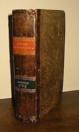 8vo (cm. 17), XVI (di XVII, manca la carta che precede la dedica) cc., 510 pp., 1 c.nn. Frontis. in rosso e nero. Legatura ‘800 in mz. pelle con fregi e titoli oro su tasselli colorati al ds. (lievi tracce di usura). Tagli gialli. Timbretti ed ex libris della ‘Bibliotheca Tiliana’. Ottimo esemplare. Prima edizione della prima versione italiana di Oppiano. Ceresoli, 390; Gamba, 2377.