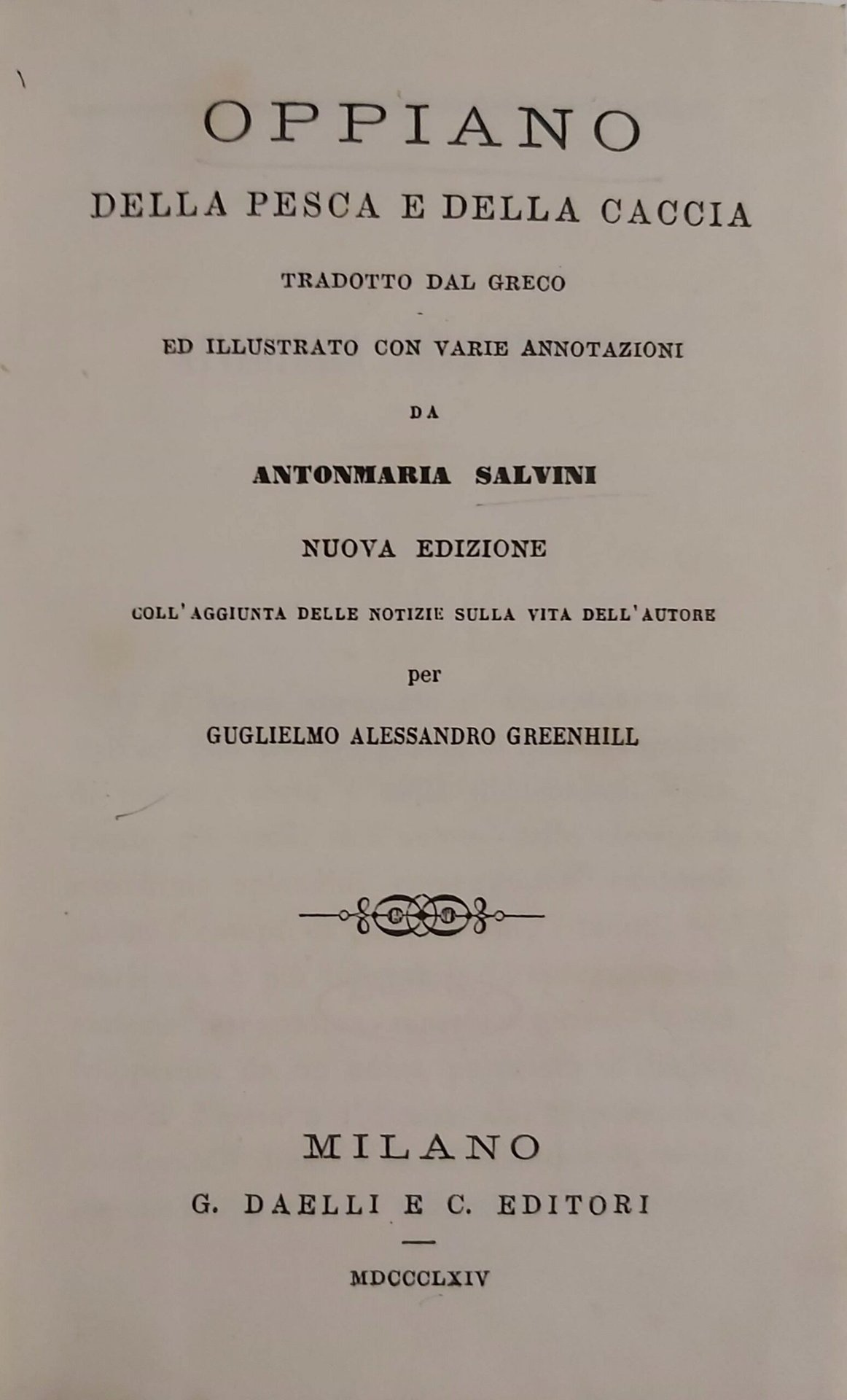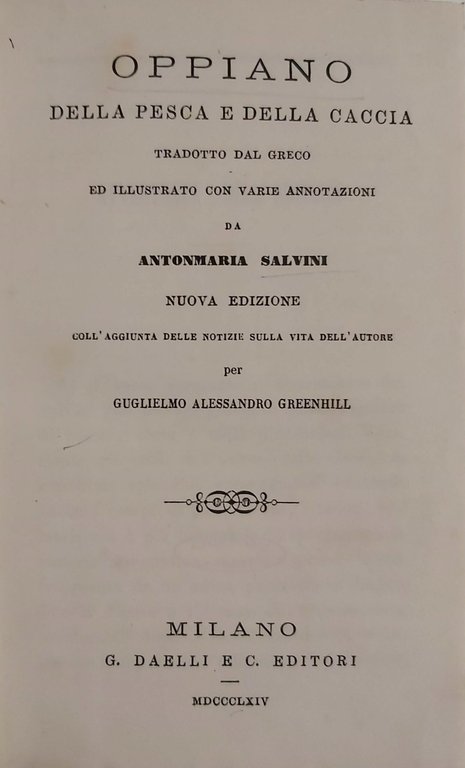 DELLA PESCA E DELLA CACCIA. Tradotto dal Greco ed illustrato con varie annotazioni da Antonmaria Salvini. Nuova edizione con l'aggiunta delle notizie sulla vita dell'Autore per Guglielmo Alessandro Greenhill.