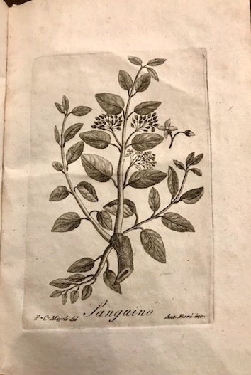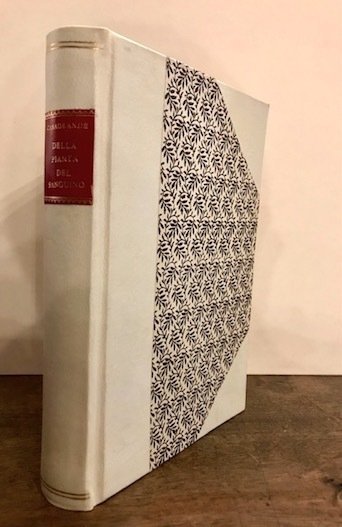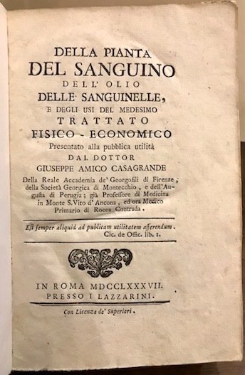 8vo (cm. 20,5), LXXII-235(1) pp. Con un ritratto di Pio VI (Dedicatario dell’opera) ed una tavola raffigurante la pianta del Sanguino. Legatura recente in mz. pergamena con angoli. Fili e titolo oro su tassello in pelle al ds. Tagli colorati. Ottimo stato di conservazione. Rara edizione originale. Curioso trattato sulla coltivazione della pianta detta della sanguinella, in cui l’Autore spiega il tempo opportuno di raccoglierne il frutto, ed il tempo e il modo di cavarne l’olio; la maniera di usarlo per gli usi domestici, e soprattutto di farne un ottimo sapone.
