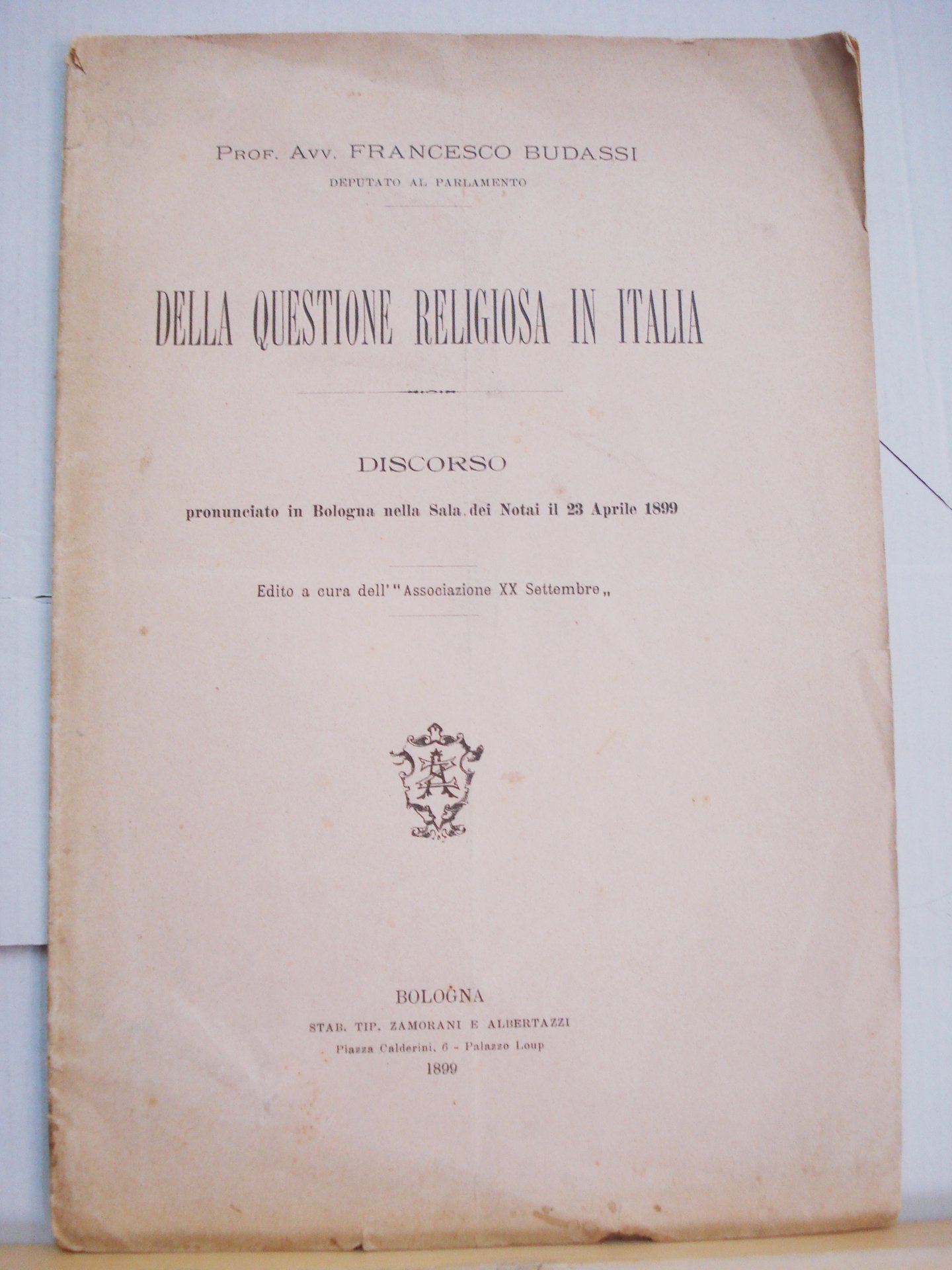 DELLA QUESTIONE RELIGIOSA IN ITALIA: DISCORSO PRONUNCIATO IN BOLOGNA NELLA SALA DEI NOTAI IL 23 APRILE 1899.