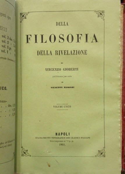Frammenti pubblicati per cura di Giuseppe Massari. Collana Opere inedite di Vincenzo Gioberti, pp 130. Volume in bella legatura mezza pelle rossa con tassello e fregi oro al dorso. Il Tomo racchiude anche il saggio DELLA FILOSOFIA DELLA RIVELAZIONE, pubblicata per cura di Giuseppe Massari, pp 166. Conservate le copertine originali all'interno. Sottolineature solo a pag 6 della seconda parte