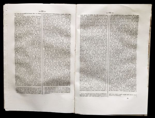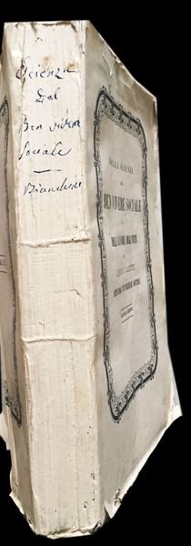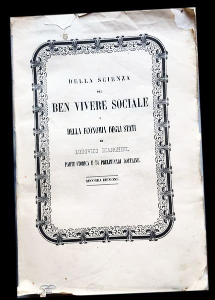 In 4° (27×18 cm); VII, (1), 547, (1) pp. Brossura editoriale, un piccolo strappetto chiuso con pecetta al margine alto del piatto anteriore uno al margine basso del piatto posteriore (senza perdite di carta), una piccola mancanza allangolo superiore del piatto anteriore. Allinterno esemplare in ottime condizioni di conservazione ancora a fogli chiusi. Seconda edizione riveduta e corretta sulla prima originale di del celebre economista, storico, politico e avvocato napoletano, Lodovico Bianchini (Napoli, 11 agosto 1803 Napoli, 10 giugno 1871). Fu uno dei più grandi conoscitori del sistema economico del Regno delle Due Sicilie e nel dibattito degli anni venti dellottocento, se lo sviluppo economico del territorio del Regno dovesse orientarsi completamente verso lindustrializzazione o anche verso lindustrializzazione si fece portatore dellistanza della creazione di un moderato protezionismo che potesse dare, al nascente sistema industriale, il tempo di crescere e svilupparsi. Intorno agli anni 30 venne chiamato da ministro delle Finanze del Regno delle Due Sicilie, Giovanni dAndrea, per aiutarlo a raggiungere il pareggio del bilancio pubblico. Fu professore di Commercio ed Economia Pubblica a Napoli, sulla cattedra che già fu di Antonio Genovesi. Dal 1854 ricoprì la carica di direttore ad interim del Ministero degli Interni. Nonostante il suo desiderio di modernizzare le Due Sicilie, le sue aspettative si scontrarono con resistenze e difficoltà insormontabili che gli impedirono di realizzare la grande maggioranze delle riforme che si era professato. Bianchini fu tra i primi un sostenitore della necessità di un forte legame fra bene sociale ed uno sviluppo industriale moderno e solidale supportato da unadeguata amministrazione pubblica. Nellopera qui presentata, seppur Bianchini ricostruisce in modo adeguato e preciso la storia del pensiero economico, sembra però dare troppa fiducia alla possibilità di una buona amministrazione di risolvere le storture di un sistema capitalistico completamente liberale e così esaltando Genovesi, Verri e Galiani, lautore guardava e restava fermo al passato e non suggeriva nessuna valida prospettiva di rinnovamento per il Mezzogiorno. Esemplare molto raro a trovarsi completo della sua brossura editoriale ed ancora a fogli chiusi. Rif. Bibl.: cfr. Einaudi 882, Ricca Salerno storia dele dottrine finanziarie in Italia pag. 389; Cossa pag. 60. Kress Italia n°1129.