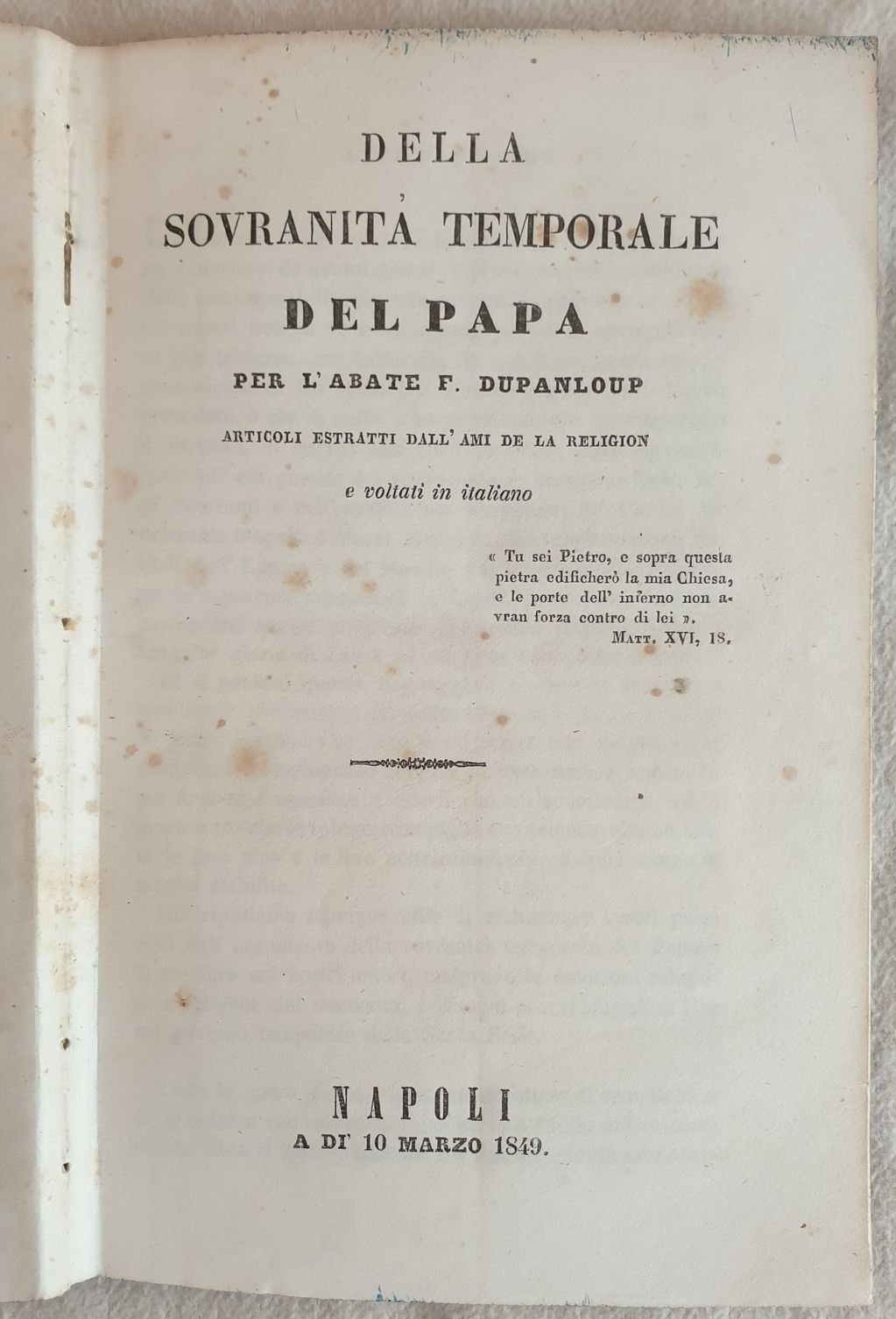 Pubblicazione del 1849 sulla sovranita temporale del Papa di Felix Dupanloup (1802-1878). In buone condizioni. Copertina assente. Legatura in discrete condizioni con lievi rotture. Pagine in buone condizioni con rare fioriture. In 16. cm. 18,5x10,5. Pp. 206+180, 256+(2)+292+(2), 398+(2)+404+(2).Pamphlet of 1849 about temporal soverain of Pope by Felix Dupanloup (1802-1878). In good conditions. Cover is missing. Binding in fair conditions with slight cracks. Inside pages are in good conditions with occasional foxings. In 16. cm. 18,5x10,5. Pp. 206+180, 256+(2)+292+(2), 398+(2)+404+(2).