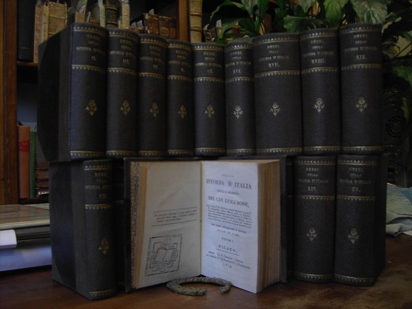 Diciannove volumi in 12 legati in tela con unghie, titolo impresso in oro al dorso ornato, sguardie ornate, occhielli, exlibris, frontespizi, prefazioni, 13650 pp. complessive, 74 tavole ripiegate ft., errata, bianche finali. Pregiata opera storiografica, ripercorre con dovizie di particolari tutti gli avvenimenti che si susseguirono da prima della fondazionbe di Roma al regno di Leopoldo I in un concatenarsi di eventi che formano una mole di ricerca assolutamente degna d'attenzione. L'Autore, socio delle pi importanti Accademie d'Italia ed indefesso studioso, riesce ad allacciare sottilissimi fili a volte slegati tra loro, illuminando le non poche zone d'ombra che nell'antichit si sono formate per la mancanza di documenti, sino a rendere omogenea e fluida la narrazione di un periodo cos vasto ed a volte incerto. Arricchita dalle preziose incisioni in rame (carte geografiche, monumenti e monete nonch ritratti di personaggi illustri). Al termine di ogni volume le tavole sinottiche che aggiungono un essenziale complemento allo studioso di Storia Patria. Edita nella prima met dell'Ottocento presentata in ottime condizioni con rare ed ininfluenti mende d'uso, in bello stato le tavole, di importante consultazione, di buona rarit