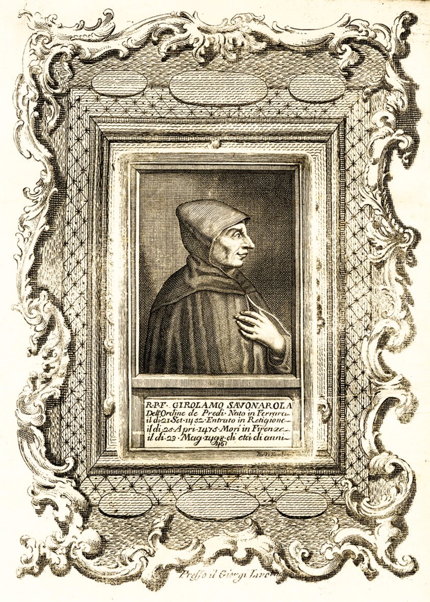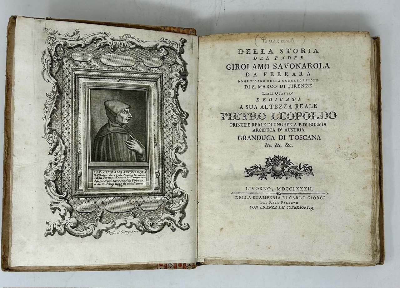 >in-4 (260x200), pp. XXIV, 345, (3, ultimo f. bianco), legatura in cartone rustico coevo, titolo ms. su tassello cartaceo al dorso. Bell' antiporta fig.inc.in rame con ritratto del Savonarola entro elaborata bordura. Prima edizione di quest'opera scritta dal Barsanti con il preciso intento di sostenere la riforma dei costumi in chiave giansenista intrapresa dalla repubblica fiorentina. La dedica a Pietro Leopoldo e la scelta del tema, per cui il Savonarola viene dipinto come la vittima delle persecuzioni della curia romana, palesano tale intento. Tuttavia l'opera rimase per anni la più accurata biografia sul frate, rivestendo una non secondaria importanza storiografica. Il Barsanti fiorì nella seconda metà del XVIII secolo, fu professore di teologia e vestì l'abito domenicano. Ottimo esemplare con barbe di opera rara e curiosa. Melzi, III, 103.