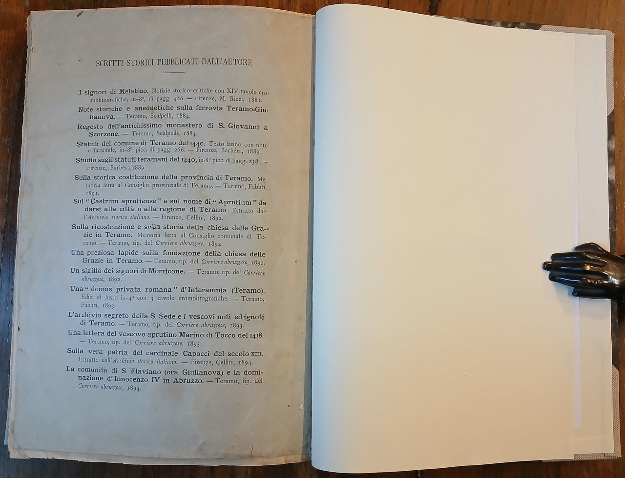 In 8°, legatura moderna in mezza tela grigia con punte, al dorso tassello in pelle nera con titoli in oro, carta decorata ai piatti, conservate le copertine della brossura editoriale, pp. LXI,(3),356,(2), con un ritratto di Muzio Muzii (Teramo 1535 - Teramo 1602), uno stemma ed un albero genealogico a doppia pagina della famiglia Muzii in Teramo. Una vecchia firma al recto del foglio di guardia anteriore. Leggero e naturale ingiallimento della carta, peraltro ottimo stato di conservazione. Edizione originale.