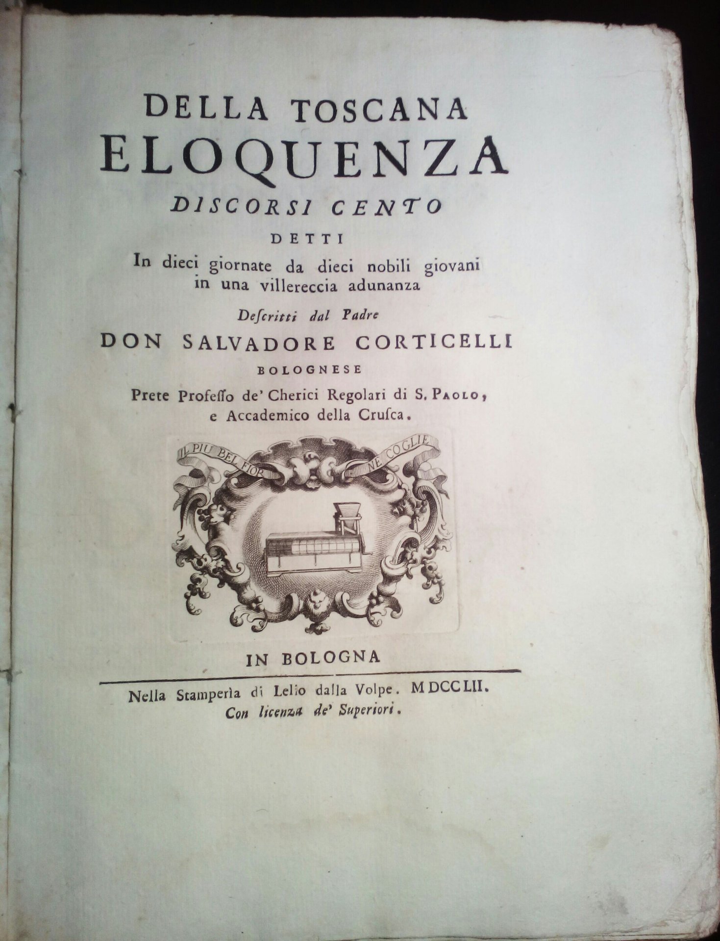 Edizione originale. In 4°, p. XVI,576. Impresa dell'Accademia della Crusca al frontespizio. Eccellente esemplare a pieni margini. Legatura coeva in cartoncino "alla rustica". Noto anche come il "Decamerone" del Corticelli, per la divisione in 10 giornate. (Gamba, 2209 "Originale, bella e corretta edizione").