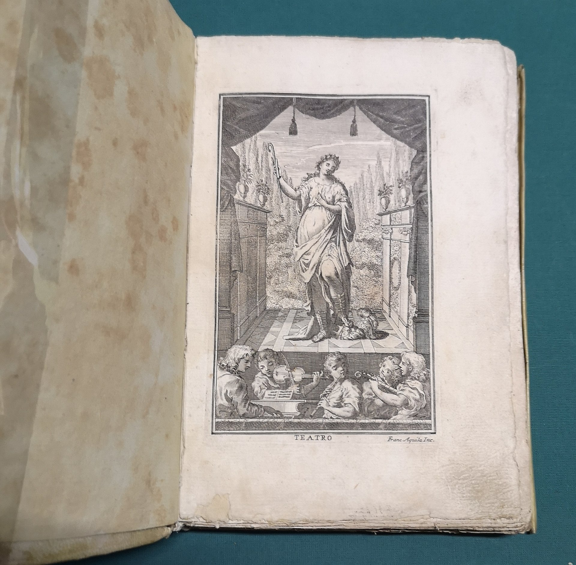 >in-4, pp.236, (4, Indice delle cose notabili), titolo in rosso e nero, bell'antiporta allegorico inciso a p.pag. raffigurante il palcoscenico con dama recitante e bimbi musicanti; leg. coeva in p.perg., dorso liscio con titolo ms. Prima edizione di importante trattato storico-critico sulla tragedia nei secoli. P.J. Martello (Bologna 1665-1727) fu letterato e drammaturgo tra i più versatili ed ingegnosi del suo tempo. ''Ma la fama del M. è affidata alla riforma teorica e pratica della tragedia (svolta col presente trattato e con altri due: ''L'Impostore, dialogo...'' e il ''Trattato del verso tragico''), riforma imperniata sulla necessità...di emancipare il teatro italiano dal francese allora dominante'' (Renda-Operti, p. 728). Ottimo esemplare a pieni margini. Natali, Il Settecento, II, pp.944-947. Soleinne n.4520.