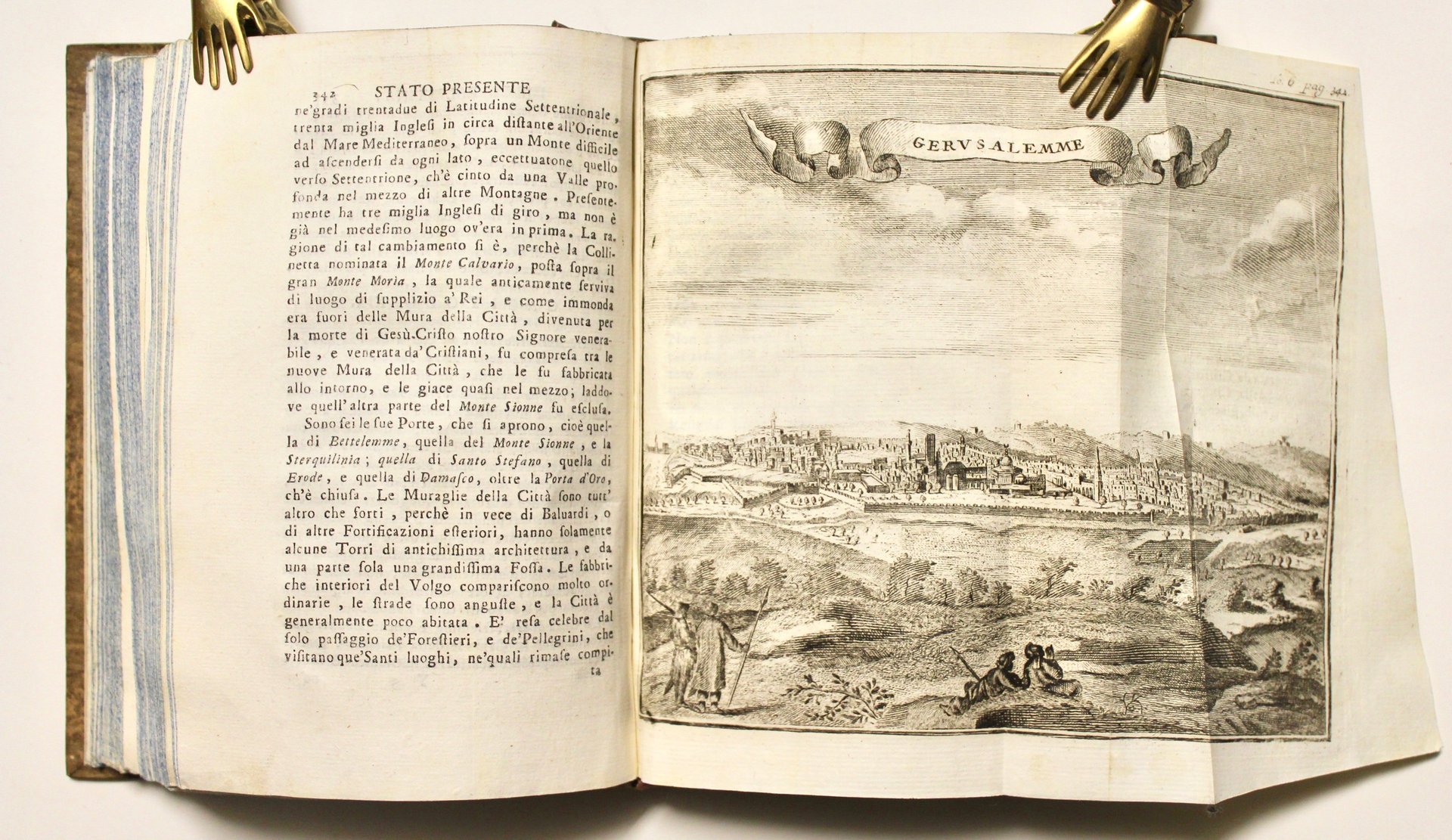 In 8° (mm 190x120), pagg. (16), 671. Antiporta allegorica in rame, 17 tavv. incise in rame, molte ripiegate tra cui due carte geografiche, vedute di Smirne, Gerusalemme, Mecca, Rodi, piramidi, ritratti, animali e piante. Testatina alla dedica con le armi di Girolamo Querini. Bella legatura in cartonato coevo marmorizzato marrone con titolo e fregi in oro su tassello arancione al dorso, tagli blu a spruzzo<BR>Seconda edizione italiana, tomo VI della celebre e poderosa opera del Salmon. <BR>Bell'esemplare. L'opera, scritta originariamente in inglese, pubblicata tra il 1737 e il 1766 e presto tradotta nelle principali lingue europee, comprendeva all'origine 26 volumi. Thomas Salmon (1679-1767), storico, geografo e poligrafo inglese, viaggiò in Europa e nelle Indie orientali e occidentali accompagnando George Anson nel suo viaggio intorno al mondo. Secondo William Cole, un antiquario inglese, Salmon scrisse la maggior parte delle sue opere a Cambridge, dove gestiva una coffee house, in seguito si trasferisce a Londra. L'opera è stata oggetto di numerose traduzioni, rifacimenti ed imitazioni in varie lingue e fu stampata in Venezia in italiano da Albrizzi nell'arco di svariati anni, arricchita di numerose incisioni originali in rame, non presenti nella versione inglese; traccia una attenta analisi storica delle nazioni del mondo, arricchita dalla descrizione geografica e artistica delle città. Cfr. Morazzoni, p. 253. Cremonini, 64. <BR>