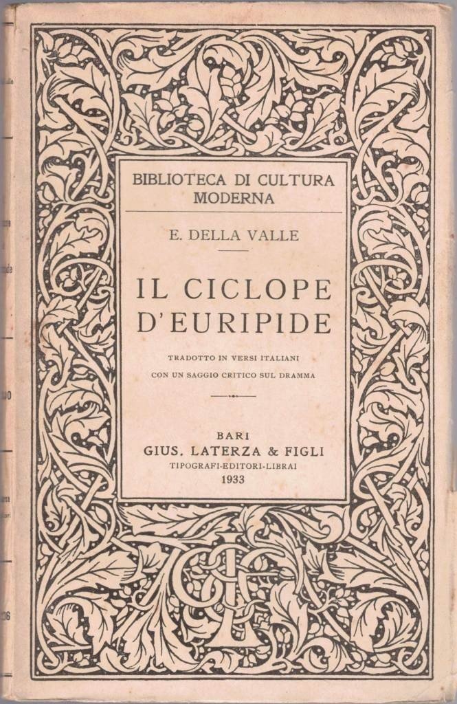 Eugenio Della Valle, Il Ciclope d’Euripide. Tradotto in versi italiani con un saggio critico sul dramma, Gius. Laterza e Figli Tipografi-Editori-Librai, Bari 1933, pp. 99, cm 20, br. ed. Collana Biblioteca di cultura moderna, vol. 236. All’occhiello, firma d’appartenenza, luogo, data e segnatura di collocazione. Minime fioriture, lievissima brunitura della carta, per il resto ottimo.