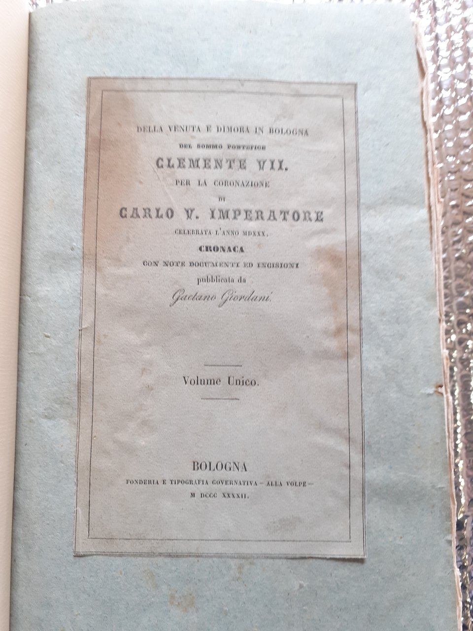 DELLA VENUTA E DIMORA IN BOLOGNA DEL SOMMO PONTEFICE CLEMENTE VII. PER LA CORONAZIONE DI CARLO V IMPERATORE CELEBRATA L'ANNO MDXXX. CRONACA CON NOTE, DOCUMENTI ED INCISIONI PUBBLICATA DA GAETANO GIORDANI, ISPETTORE DEL P. PINACOTECA: SOCIO ONORARIO DELLA BOLOGNESE ACCADEMIA DI BELLE ARTI, DELLA I. R. DI FIRENZE, DELLA INSIGNE ARTISTICA CONGREGAZIONE DE' VIRTUOSI AL PANTEON, DELLA I. R. SOCIETA' ARETINA, E DI ALTRE LETTERARIE ACCADEMIE D'ITALIA.,