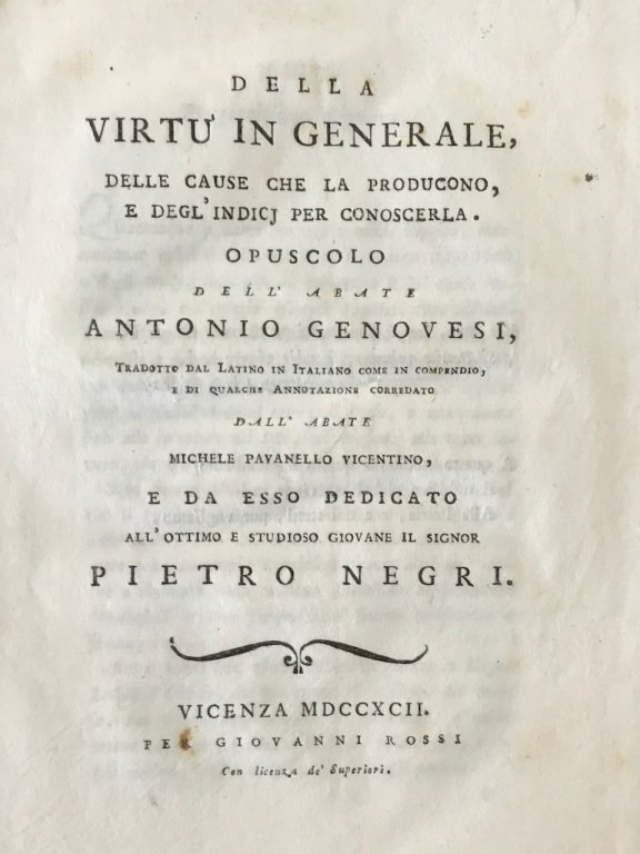 In-8° (cm. 23), brossura azzurrina muta coeva, pp. LII in barbe, fioriture sparse. Libro in edizione tradotta dal latino «come in compendio, e di qualche annotazione corredato dall'Abate Michele Pavanello vicentino, e da esso dedicato all'ottimo studioso giovane il signor Pietro Negri». Buon esemplare. (NJ1)