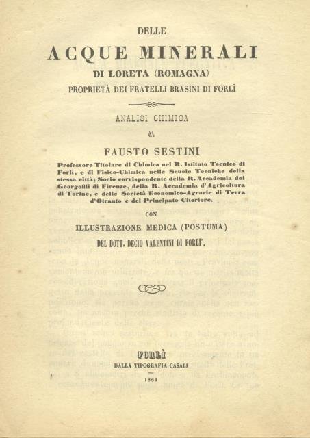 DELLE ACQUE MINERALI DI LORETA (ROMAGNA) PROPRIETA' DEI FRATELLI BRASINI DI FORLI'. Analisi chimica. Illustrazione medica (postuma) di Decio Valentini di Forlì con documenti di altri valenti professori.
