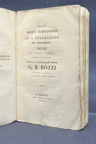 Bergamo, Stamperia Natale, 1820. In - 8ø; 152 pp.; copertine editoriali a stampa. Ottimo esemplare intonso. Prima edizione. L'opera contiene una analitica descrizione delle virt— medicinali e dietetiche delle acque di S. Pellegrino. Lozzi 320.
