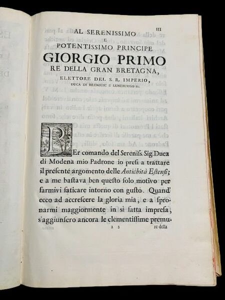 In folio; XXXI, (1), 439, (1) pp. e (13) c. di tav. (carte genealogiche, antiporta calcografica), (16), 736 pp. Bella legatura coeva in piena pergamena rigida. Titolo e autore in oro su fascette in pelle (qualche piccola mancanza). Fascetta segnalibro in seta verde. Antiporta calcografica incisa da Francesco Maria Francia su disegno di Antonio Consetti. Medaglione con ritratto di Francesco III al frontespizio del secondo volume. Prima non comune edizione di uno degli studi più importanti del celebre presbitero, storico, scrittore, numismatico, diplomatista e bibliotecario italiano, Ludovico Antonio Muratori il cui nome, a volte, è citato anche come "Lodovico Antonio" (Vignola, 21 ottobre 1672 Modena, 23 gennaio 1750). Padre della storiografia moderna e della medioevalistica nella quale diede importantissimi contributi attraverso il recupero di documenti storici dispersi in diversi archivi pubblici e privati italiani. Personaggio di enorme erudizione, Muratori produsse testi dedicati a numerose e diverse materie dove mise la "verità" come faro delle proprie ricerche sia in ambito storico che religioso. Il Duca di Modena e Reggio, Rinaldo I d'Este, lo ebbe in grande considerazione offrendogli l'ufficio d'archivista e bibliotecario ed impiegandolo in numerose importanti ambasciate. Figura di primissimo piano nella cultura europea del settecento fu in contatto epistolare con numerosissimi personaggi celebri e potenti dell'epoca. L'opera qui presentata che riscotruisce la storia della famiglia d'Este dalle origini, è il risultato di una celebre disputa di successione territoriale, nella quale venne implicata la famiglia d'Este nella quale Rinaldo I chiamò, proprio Muratori, a difendere ed esporre le pretese successorie della sua famiglia. Come ben ricostriusce Girolamo Imbruglia, nel Dizionario Biografico degli Italiani, Treccani, Volume 77, (2012) alla voce dedicata a Muratori: "A questi anni risalgono le Antichità estensi. A Fontanini, che aveva affermato che gli Este non erano che una nobile famiglia patavina, Muratori rispose ricostruendone la genealogia. Sapeva che «fra i romanzi e le genealogie non passava gran divario, pochi essendo coloro che si facessero scrupolo di aggiungere di suo capo ciò che mancava» (Opere, 1964, p. 27). Ma «non mi sentiva già io di servir così male alla vera nobiltà del mio principe e né pure alla riputazion mia» (ibid.). A guidarlo anche qui fu Leibniz. Il loro lavoro procedette daccordo (Leibniz propose di scrivere insieme le Vindiciae estenses), sebbene a Muratori pesassero limpegno suo per la polemica di Comacchio e la ponderatezza del tedesco. Tra il 1714 e il 1716 compì indagini archivistiche nel centro Italia formidabili per ideazione e risultati. Nel 1715 spedì a Leibniz, impegnato negli Annales brunswicienses, la prima parte delle Antichità, che apparve a Modena, nel 1717, nella stamperia ducale, nonostante il parere contrario del filosofo. Il secondo volume seguì nel 1740. Esibire le «pruove» rimuovendo ogni fonte non verificabile e risalire nel tempo fin dove fosse possibile poggiare sulla certezza e sul «vero» fu il metodo esposto nella Prefazione (p. XIX). Tale volume delle Antichità estensi fu il primo, grande lavoro da medievista di Muratori, che integrò la lezione diplomatica dei gesuiti e dei maurini, quella oratoriana di Malebranche e Simon e quella storico-giuridica di Leibniz in una visione storica originale (Bertelli, 1960, 251). Aveva dimostrato che allorigine della nobiltà europea e italiana stavano i barbari germani e non i romani, e aveva avviato su salde basi la nuova considerazione del Medioevo, aprendo nuove prospettive alla storiografia europea. Il punto di partenza è dato da Alberto Azzo II, longobardo: questi nellXI secolo governava il feudo dEste e sposò dapprima Cunegonda da cui nacque Guelfo IV, poi duca di Baviera e fondatore della dinastia di Hannover Brunswick e quindi, in seconde nozze, Garisenda del Maine, il cui figlio Folco ebbe il feudo paterno e fu allorigine della linea italiana. La ricostruzione risale fino a Adalberto I di Toscana, che costituisce il limite della certezza. A partire dal XXVI capitolo il discorso ritorna su Azzo II e i suoi discendenti, il matrimonio di Guelfo V con Matilde di Canossa, le lotte tra guelfi e ghibellini, i rapporti con Federico Barbarossa di Obizzo I, al quale si dovette la fondazione (1188) del dominio estense a Ferrara. Il secondo volume inizia dal 1215 con Azzo VII, confuta la pretesa interruzione del dominio estense su Ferrara con Alfonso I e giunge a Rinaldo I.". Prima edizione in ottime condizioni di conservazione ed a grandi margini.