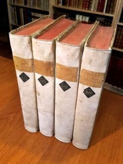 4 volumi in-4° (cm. 26), genuine legature coeve in m. pergamena con titolo in oro su tasselli al dorso, piatti in carta decorata (usura a un tassello), tagli rossi; carte in ottimo stato e in barbe, con ampie testate in rame n.t. e 7 tavole illustrative in rame f.t. (di cui 6 ripiegate). Edizione originale di un'opera «assai stimata» [Lozzi 2595] e «piena di erudizione e dottrina» [Cicognara 3933] composta da 40 dissertazioni relative ai secoli di mezzo, frutto di faticosi studi su codici cistercensi inediti, specialmente di Chiaravalle e Sant'Ambrogio (qui trascritti e illustrati). La varietà degli argomenti comprende gli edifici di Milano, la coltivazione degli olivi in Lombardia, la struttura sociale dei Longobardi, le vicende monastiche, ecc. Cfr. Predari 148; Hoepli 693. Ottimo esemplare. (SK2 - 2C. SM2)