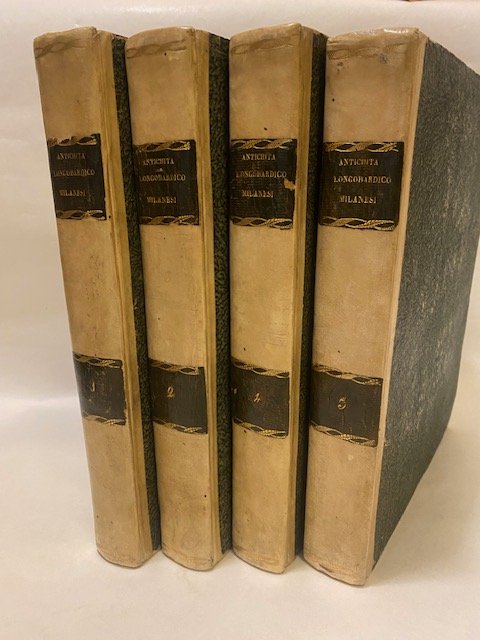 Opera in 4 volumi con legature coeve mezza pergamena con angoli, dorso con doppio tassello, titolo e fregi oro. Esemplari in ottime condizioni, carte bianche ampi margini. Opera di grande erudizione edita dalla Stamperia del Monastero di S. Ambrogio e illustrata da 7 tavole incise in rame e di grandi testate all’inizio delle Dissertazioni. Gli argomenti sono i più vari: si va dalla topografia e degli edifici di Milano (con illustrazioni e piante) alla coltivazione degli olivi in Lombardia nei secoli IV e X, dalla struttura sociale dei Longobardi alle guerre di Federico I (con modifiche rispetto al trattato del 1778), dalle vicende degli ordini monastici in Milano al rito ambrosiano, il tutto intercalato alla trascrizione e illustrazione di importanti documenti inediti. L’autore è considerato fra i più grandi storici lombardi del Settecento.