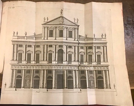 4to (cm. 24), VIII-CXXXV pp. Ritratto di Andrea Palladio in antiporta e 8 tavv. più volte ripiegate f.t. Iniziali, testatine e finalini xilografici. Legatura coeva in pergamena rigida con titolo impresso al ds. (piccola mancanza alla cuffia superiore). Tagli rossi. Lievi ossidazioni marginali ma, nel complesso, esemplare in ottimo stato di conservazione. Rara prima edizione. Provenienza: Collezione Moretti, Roma (due timbretti ex libris al frontespizio). Per la seconda edizione del 1769, cfr. Fowler (n. 30) e Cicognara (n. 876).