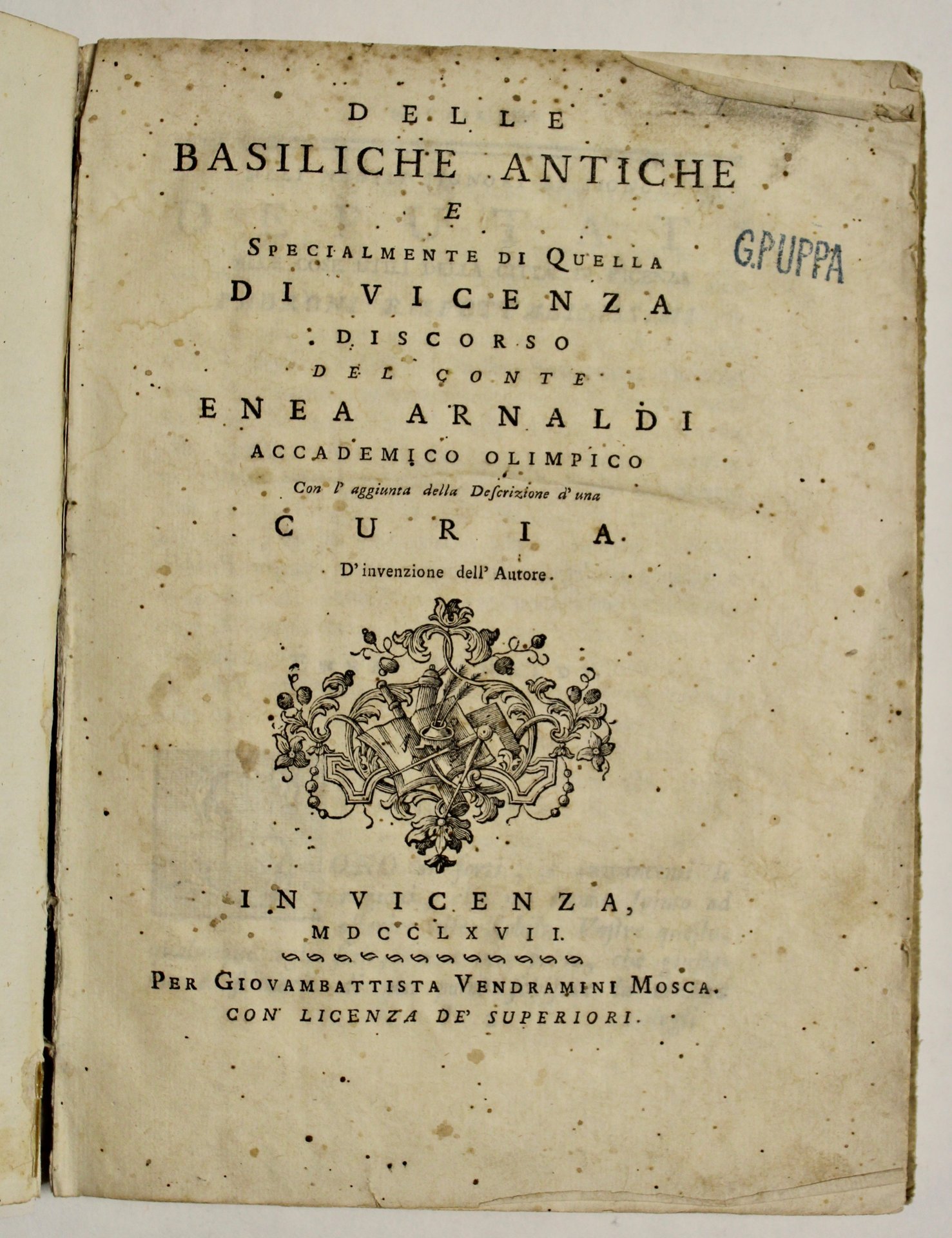 In 4° (mm 226 x 170). Pp.VIII, CXXXV, 4 tavv. rip.f.t. (su 8) più volte raffiguranti prospetti e piante sulla Basilica palladiana di Vicenza. Frontespizio con piccolo fregio sotto il titolo e timbro blu di possesso "G. Puppa" in alto a destra. <BR>Dedica iniziale ai nobili Signori deputati della città di Vicenza e prefazione. Capilettera silografici alle pp. III, VII, VIII, della dedica e della prefazione.<BR>Capilettera silografici alla p. I, IX, LX, CX del testo. Fregi e finalini sono posti all'inizio e al termine delle varie parti in cui è suddiviso il testo.<BR>Legatura in pergamena con titolo manoscritto al dorso. Prima edizione, opera importante per la storia civile ed artistica di Vicenza. Volume in buono stato di conservazione con ampi margini.Mancante del ritratto di Palladio. La prima delle quattro tavole presenta uno strappo. Cicognara 876. € 380<BR>. Delle Basiliche antiche e specialmente di quella di Vicenza, Discorso del Conte Enea Arnaldi accademico olimpico con l'aggiunta della descrizione d'una Curia. Vicenza, per Giovambattista Vendramini Mosca, 1767.<BR>In 4° (226 x 170). Pp.VIII, CXXXV, 4 tavv. rip.f.t. (su 8) più volte raffiguranti prospetti e piante sulla Basilica palladiana di Vicenza. Frontespizio con piccolo fregio sotto il titolo e timbro blu di possesso "G. Puppa" in alto a destra. <BR>Dedica iniziale ai nobili Signori deputati della città di Vicenza e prefazione. Capilettera silografici alle pp. III, VII, VIII, della dedica e della prefazione.<BR>Capilettera silografici alla p. I, IX, LX, CX del testo. Fregi e finalini sono posti all'inizio e al termine delle varie parti in cui è suddiviso il testo.<BR>Legatura in pergamena con titolo manoscritto al dorso. Prima edizione, opera importante per la storia civile ed artistica di Vicenza. Volume in buono stato di conservazione con ampi margini.Mancante del ritratto di Palladio. La prima delle quattro tavole presenta uno strappo. Cicognara 876. € 380<BR>