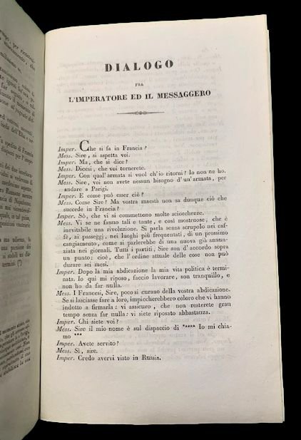 In 4° (22x13,5 cm); 76 pp. Legatura coeva in mezza-pelle con titolo, filetti e fregi floreali in oro al dorso. Alcuni numeri scritti al recto del piatto anteriore. Carta leggermente azzurrina. Esemplare in perfette condizioni di conservazione ed ad ampi margini. Prima traduzione italiana, in parte rielaborata, di questa ricostruzione della fuga di Napoleone dalla sua prigionia all'Isola d'Elba. Per il nome dell'autore, Cesare De Laugier, e per il legame (di traduzione) con La verité sur les cent jours principalement par rapport à la renaissance projetée de l'Empire romain par un citoyen de la Corse di Georges Libri si veda Bagnano cfr. DBI, ad vocem. Cesare De Laugier, conte de Bellecour (Portoferraio, 15 ottobre 1789 Fiesole, 25 maggio 1871) fu generale e scrittore originario di Portoferraio fu ufficiale ufficiale dell'esercito napoleonico nelle campagne di Spagna e di Russia. FU anche al servizio di Murat e militò nell'esercito del Granducato di Toscana come generale. Nel 1848 guidò un piccolo contingente inviato alla difesa dell'insorta repubblica di Venezia. L'opera raccoglie numerosa documentazione e corrispondenza inedita legata alla fuga di Napoleone dall'Isola d'Elba ed ai susseguenti 100 giorni. Esemplare in prima edizione ed in perfette condizioni di conservazione.