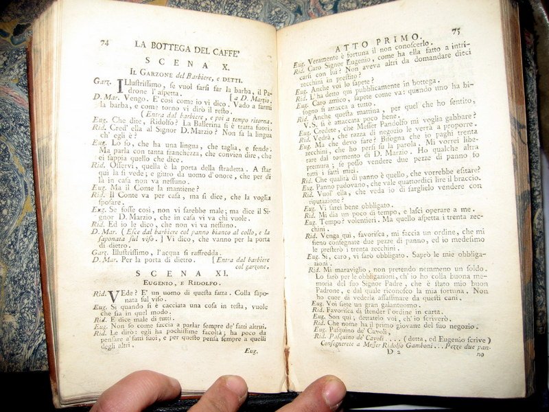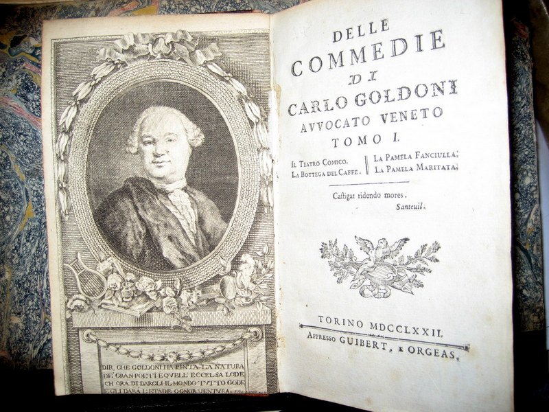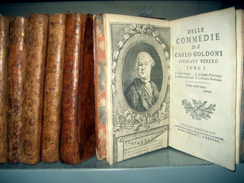 >34 volumi in-12, legatura coeva in p. vitello biondo (con piccole, sporadiche mancanze), titolo e fregi in oro al dorso, tagli marmorizzati. Ritratto di Goldoni inciso in rame, in antiporta al primo volume. Rara edizione torinese settecentesca di tutte le commedie goldoniane. Perfetto esemplare. Spinelli, p.134-142.
