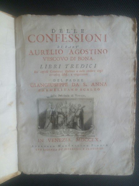 DELLE CONFESSIONI. LIBRI XIII DA COPIOSI COMMENTARI ILLUSTRATI E DALLE CENSURE DEGLI AVVERSARI DIFESI : E VOLGARIZZATI DEL PADRE GIUSEPPE DA S. ANNA CARMELITANO SCALZO DELLA PROVINCIA DI VENEZIA.