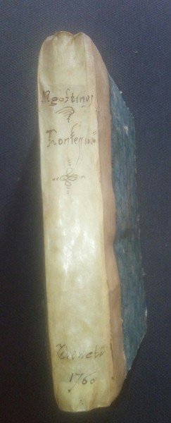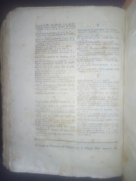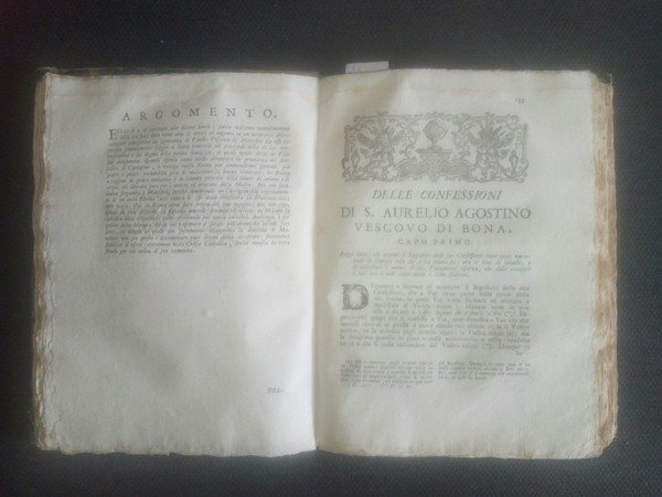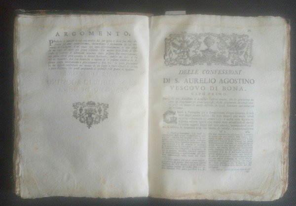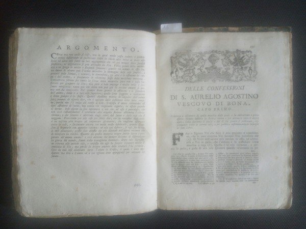 AUGUSTINUS S. AURELIUS. DELLE CONFESSIONI. LIBRI XIII DA COPIOSI COMMENTARI ILLUSTRATI E DALLE CENSURE DEGLI AVVERSARI DIFESI : E VOLGARIZZATI DEL PADRE GIUSEPPE DA S. ANNA CARMELITANO SCALZO DELLA PROVINCIA DI VENEZIA. Venezia, M. Piotto 1760.[Teologia-Prima edizione] ( Cm 26,7) buona mz. pergamena originale, piatti in carta policroma tit. al dorso.--- pp. (4), (2), 567,(5). Frontis rosso e nero con bella vignetta in rame incisa da Carolus Calcinotto. Edizione originale di questa pregiata traduzione, dedicata a Clemente XIII e superiore ai volgarizzamenti del Gagliardi e dell' Indrizzali. Qualche lieve e rara fioritura ma esemplare bello e fresco a grandi margini con barbe. --- PAITONI I 20. Molto raro, manca all' ARGELATI " VOLGARIZZATORI".[f16]