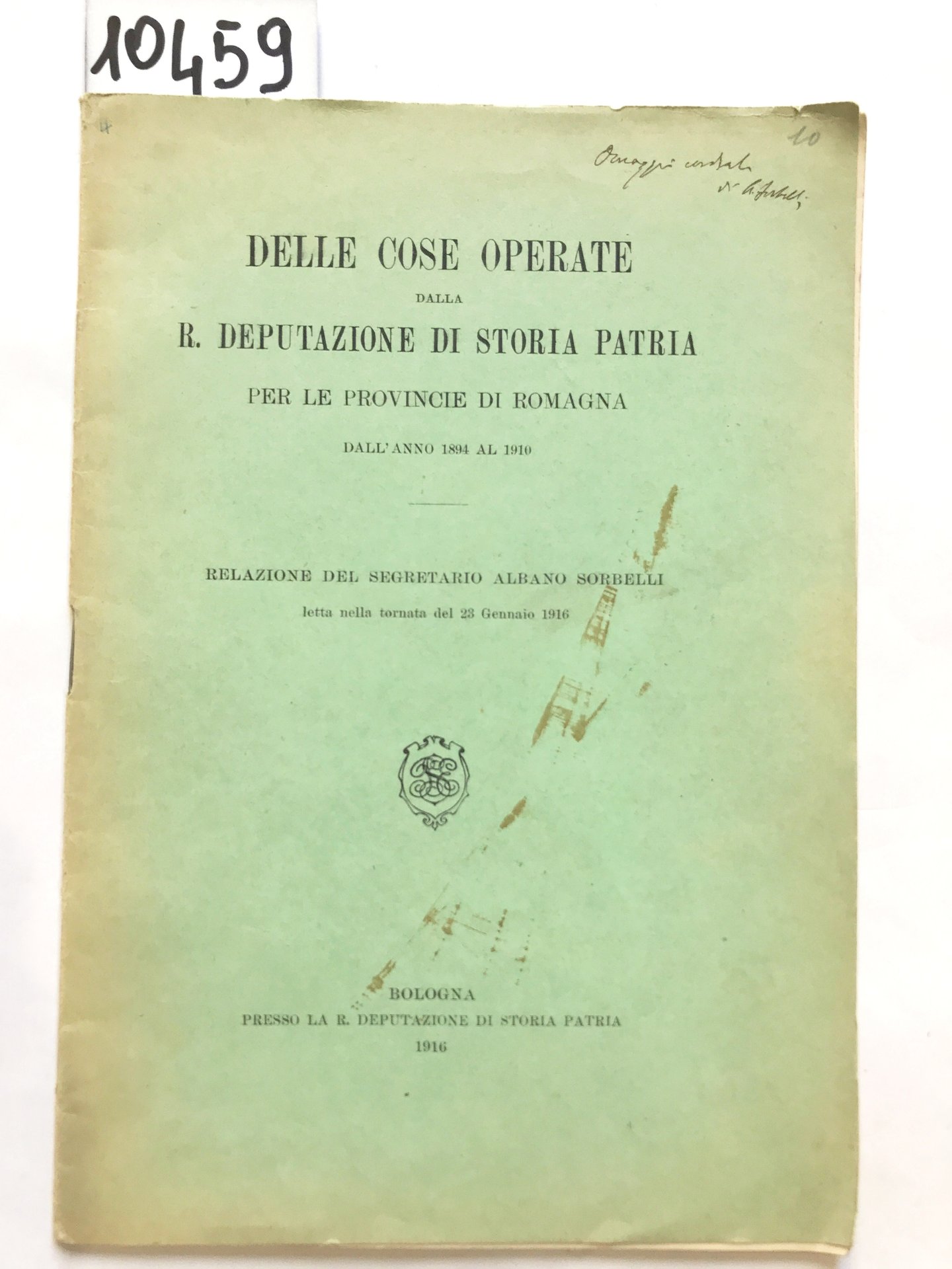 DELLE COSE OPERATE DALLA R. DEPUTAZIONE DI STORIA PATRIA PER LE PROVINCIE DI ROMAGNA DALL'ANNO 1894 AL 1910. Relazione del Segretario Albano Sorbelli letta nella tornata del 23 Gennaio 1916.