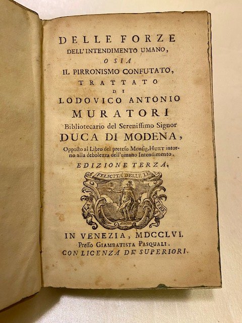 Ottima legatura coeva in tutta pergamena rigida, dorso con tassello, titolo in oro, tagli colorati. Miscellanea filosofica di tre opere di L. A. Muratori. Belle testatine e finalini in silografia. Sc. S.