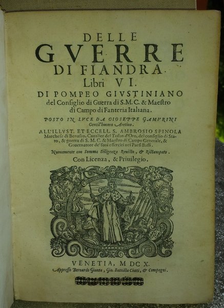 Delle guerre di Fiandra libri VI di Pompeo Giustiniano del Consiglio di Guerra di S. M. C. & Maestro di Campo di Fanteria Italiana.Posto in luce da Gioseppe Gamurini, gentiluomo aretino. All'ìillust. Et eccell. Ambrosio Spinola Marchese di Bernasro, Cavalier del Toson d'Oro, del consiglio di Stato, & guerra di S. M. C. & Maestro di Campo Generale, & Governatore de' suoi essercizi nei Paesi Bassi.Nuovamente con somma diligenza revisto, & ristampato. Con licenza & privilegio.