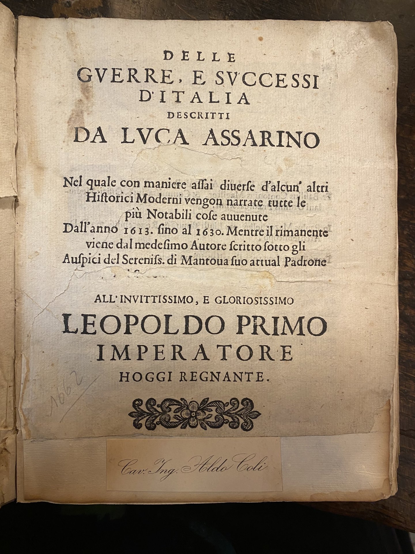 Delle Guerre e successi d'Italia descritti da Luca Assarino nel quale con maniere assai diverse d'alcun'altri historici moderni vengon narrate tutte le più notabili cose avvenute dall'anno 1613 fino al 1630, mentre il rimanente viene dal medesimo autore scritto sotto gli auspici del sereniss. di Mantova suo attual padrone all'invittissimo e gloriosissimo Leopoldo Primo Imperatore hoggi regnante