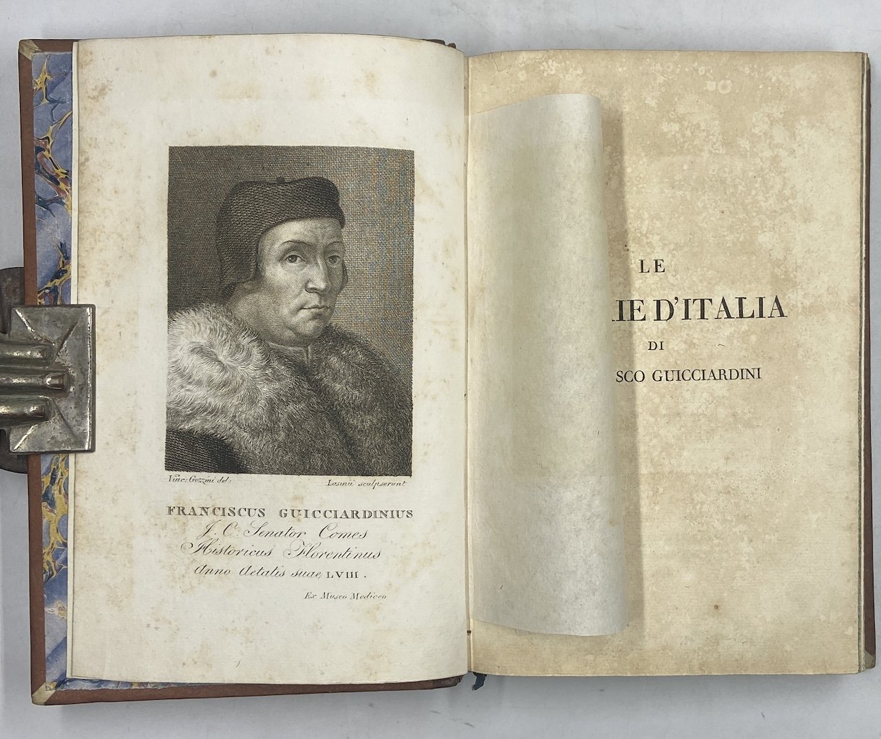 Otto volumi in mezza pelle con titoli e fregi dorati sui dorsi a 5 falsi nervi (difetti sull’ottavo tomo), 8vo cm14x21, pp LIII (1) 263 (1), 351 (1), 334 (2), 384, 352 (2) 368, 290 (2) 32, (8) CLXI (7); anteposto all’occhietto del primo volume e protetto da velina si trova un ritratto dell’autore disegnato da Vincenzo Gozzini e inciso dai Lasinio. In calce al volume settimo il breve saggio bibliografico DEL CODICE MEDICEO LAURENZIANO N. CLXVI ESPOSIZIONE CRITICA-BIBLIOGRAFICA di Luigi Brichieri Colombi, il volume ottavo è costituito dall’Appendice che contiene gli indici dell’opera e vari scritti politici, con discorsi di Pietro Guicciardini e Francesco Vettori.