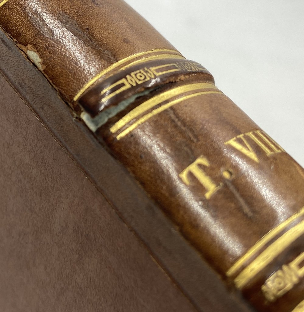 - Complessivamente buon esemplare, completo del ritratto e di tutti gli occhietti; qualche arrossamento e fioritura, e piccoli difetti di legatura. Sulla sguardia anteriore di ciascun volume tracce della rimozione di etichette ex libris, con qualche abrasione e rottura della carta marmorizzata, fessurata la pelle lungo la cerniera anteriore esterna del quint volume, e parzialmente staccato uno dei falsi nervi sul dorso dell’ottavo volume.