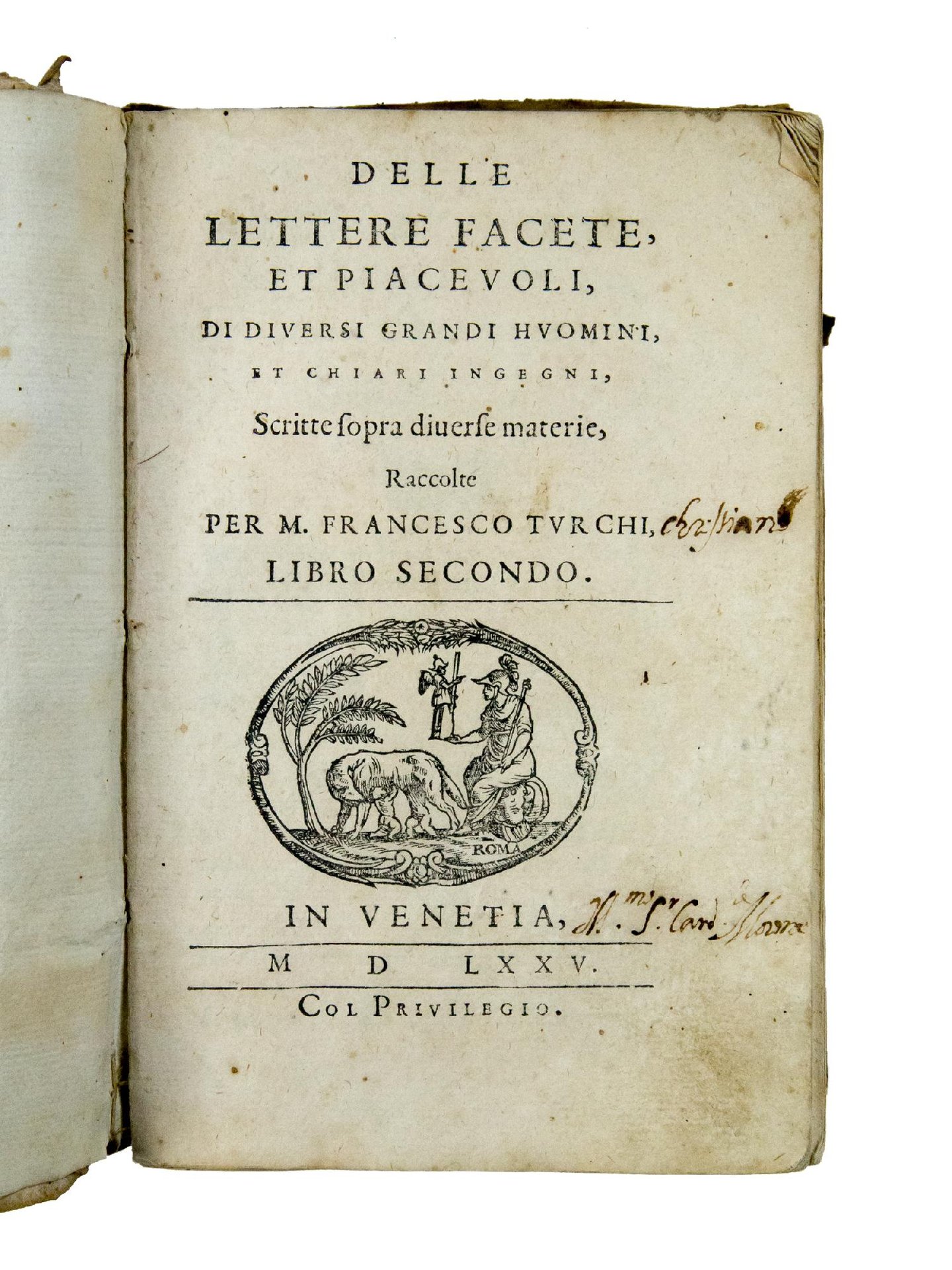 “La onde et V.Ecc. [Matteo Fino] et io, dobbiamo non poche lodi et gratie al virtuosissimo Sig. Aldo Manuzio, poi che per la impresa, ch'egli mi diede questi mesi passati di raccorre queste [l]ettere ella si fa certa che non impiega i suoi beni in soggetto, che le sia ingrato, […] Né punto meno dobbiamo lodare l'anima di M. Dionigi Atanagi, huomo del numero de gli huomini più illustri nelle buone lettere dell'età nostra, che fu il primo, che raccogliesse et facesse imprimere simili sorti di lettere: percioche egli già raccolse, et diede in luce il primo libro, et pose mano a questo secondo: il quale essendo da lui a pena cominciato, fu sopraggiunto da immatura morte, et da me poi con gli originali de' propri autori havuti da diverse persone, finito di raccorre: sperando con esso parimenti dilettare, et giovare al mondo” (l. *3r-v). The attribution of the printing to Aldo Manuzio is also confirmed by the inventory of the books present in Manuzio's shop (ms. Vat. Lat. 7129), which lists 135 copies of Turchi's Libro secondo (cf. E. Russo, Il mercato dei classici: la letteratura italiana nella bottega di Aldo Manuzio il giovane, in: “Nuovi Annali della Scuola speciale per Archivisti e Bibliotecari”, XIV, 2001, pp. 51-52 and no. 175).