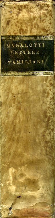 2 voll. in un tomo in-8°, pp. LXIII, 284; (2), 304; legatura coeva p. pergamena marmorizzata con titolo in oro su tassello in pelle al dorso. Tagli marmorizzati policromi. Vignette incise ai frontespizi. Dedicatoria alConte Orsini Rosenberg. Qualche alone e fioritura ai risguardi, alcune minimali gore marginali e sottolineature. Manca la tavola incisa col ritratto del Magalotti. Bell'esemplare. Edizione in parte originale, differente da quella del 1719 e dalle successive ristampe; 'raccolta pregevolissima, pubblicata da monsig. Angelo Fabroni. Contiene Lettere assai importanti, non senza qualche breve Componimento poetico del Magalotti. Sta in fronte la Vita dell'Autore, già scritta in latino dal Fabroni, e qui volgarizzata dal can. Pier Nolasco Cianfrogni' (Gamba). Le lettere magalottiane esorbitano di gran lunga dal carattere di un mero scambio familiare o amicale, per tramutarsi, invece, in veri e propri trattati scientifici o di varia natura: Sulle terre odorose d'Europa e d'America dette volgarmente Buccheri, scritte alla signora Marchesa Strozzi; Selva di una lettera al Principe Leopoldo, con cui si pretende d'assegnare un modo, come gli odori possan essere senza che da' corpi odorosi fluisca un minimo che della sostanza; Comento sopra i primi cinque canti dell'inferno di Dante; Discorso Accademico in cui si raccontano i casi di Tantalo; Lettera al Signor Roberto Boyle in materia di controversia; Al principe Leopoldo sopra il vacuo; A Filippo Bonarroti sull'etimologia di Lonchio; Ristretto intorno alla Pace de Pirenei; Trattato del Gran Duca Cosimo per regolare il commercio del vino, etc. Gamba, 1980. Razzolini / Bacchi della Lega, pp. 213-214. Cat. Libri, 1861, 4385: 'This collection is very important for the history of the sciences in Tuscany during the XVII century.'. Carli-Favaro, 538: 'Oltre alle lettere del M. ve ne sono del Viviani e del Redi'.