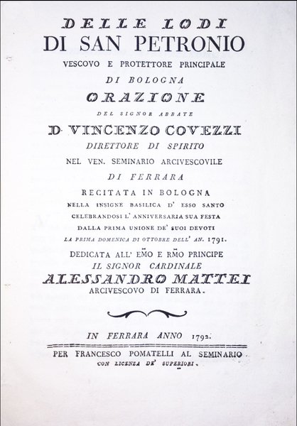Delle lodi di San Petronio vescovo e protettore principale di Bologna orazione del signor abbate d. Vincenzo Covezzi direttore di spirito nel ven. seminario arcivescovile di Ferrara recitata in Bologna nella insigne basilica d'esso santo celebrandosi l'anniversaria sua festa dalla Prima Unione de' suoi devoti la prima domenica di ottobre dell'an. 1791. Dedicata al […] cardinale Alessandro Mattei arcivescovo di Ferrara.